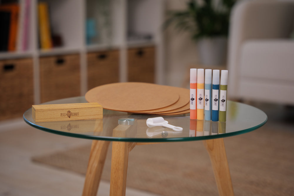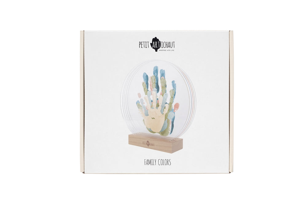 Le Family Colors permet à 5 membres de la famille d’apposer leur propre empreinte sur un panneau de plexiglas, créant par jeu de superposition un seul cadre coloré et personnalisé. Chaque kit comprend 5 panneaux transparents, 1 jolie base en bois pour support, 5 tubes de peinture, 1 rouleau pour application ainsi qu’un descriptif pour créer facilement les empreintes. Une façon moderne et originale d’afficher l’unité et l’amour familial dans la décoration intérieure.