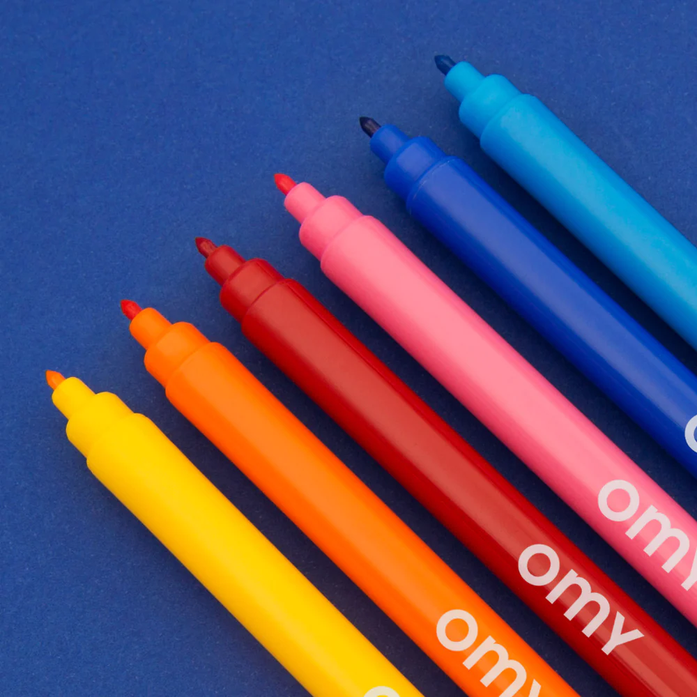 Boîte de 16 feutres ultra-lavables aux couleurs éclatantes. Complément indispensable des coloriages OMY, ces feutres double-pointe (fine et large) se nettoient facilement à l’eau et au savon et promettent de longues heures de dessins! Pratique, la boîte se transforme en pot à crayons à la maison!