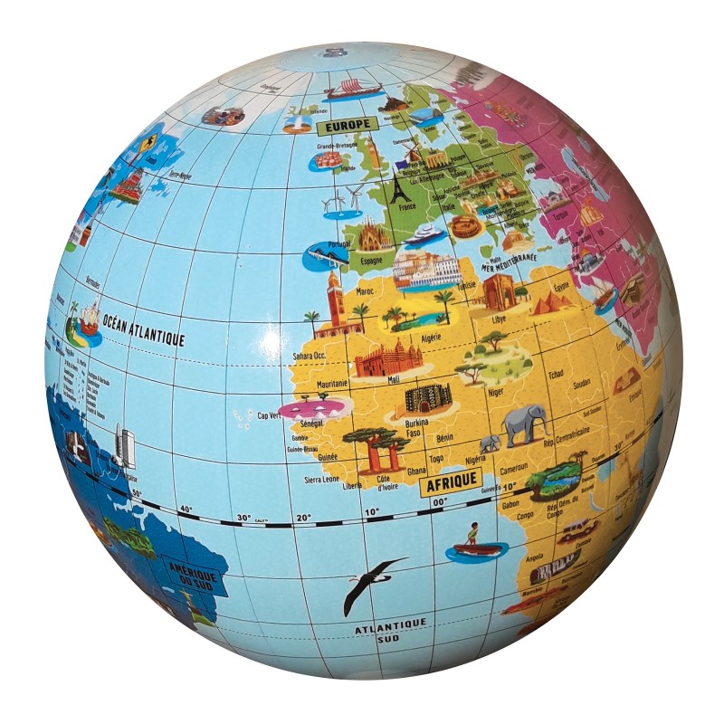 Globe gonflable de 42 cm de diamètre pour partir à la découverte des pays et des curiosités du monde : La barrière de corail, le Golden Gate Bridge, La Tour Eiffel …