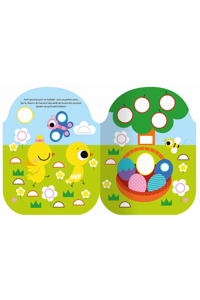Un cahier de plus de 300 gommettes de formes géométriques, qui servent à compléter l’histoire de petit poussin, à travers un cahier de décors détachable. Une activité parfaite pour favoriser l’éveil et la motricité des tout-petits !