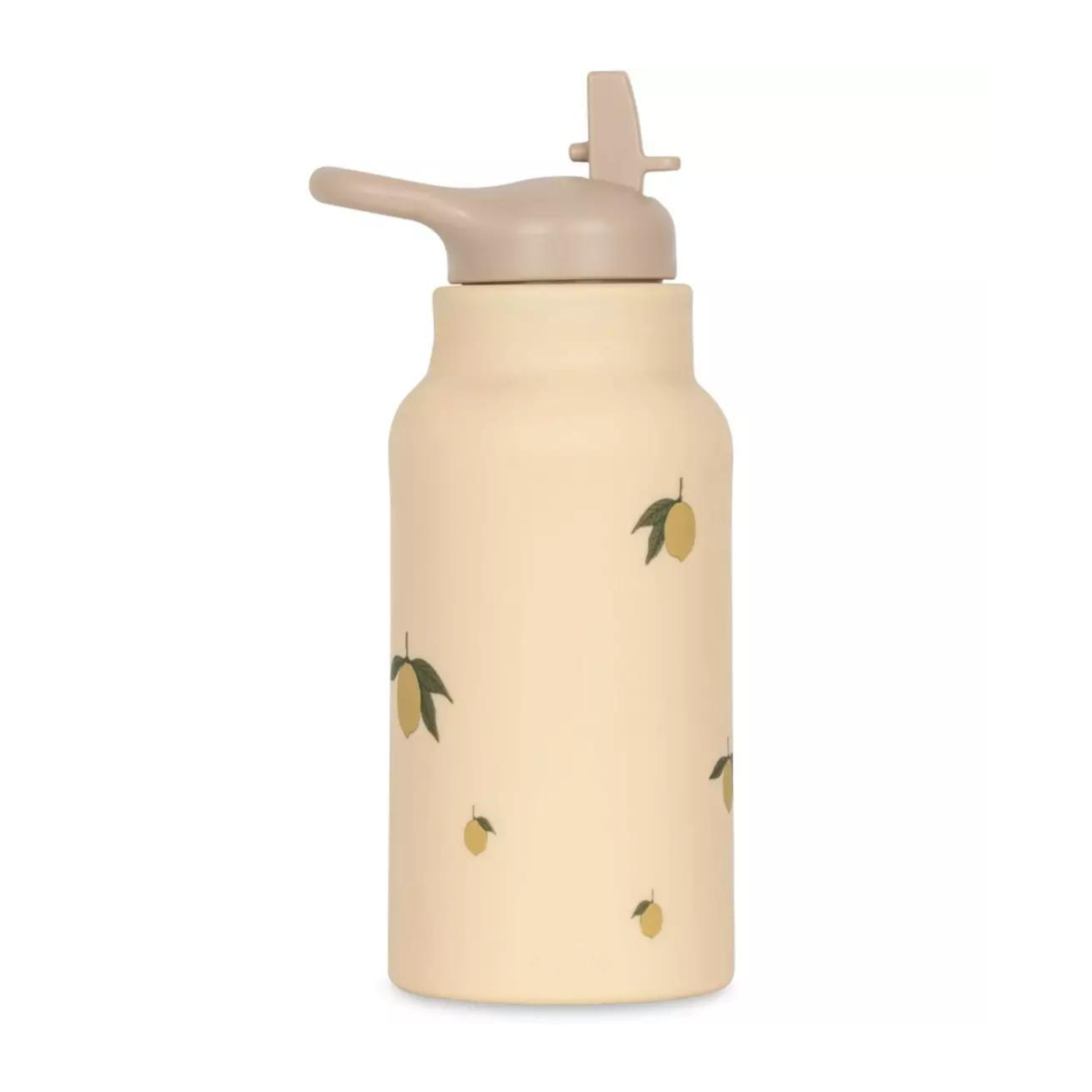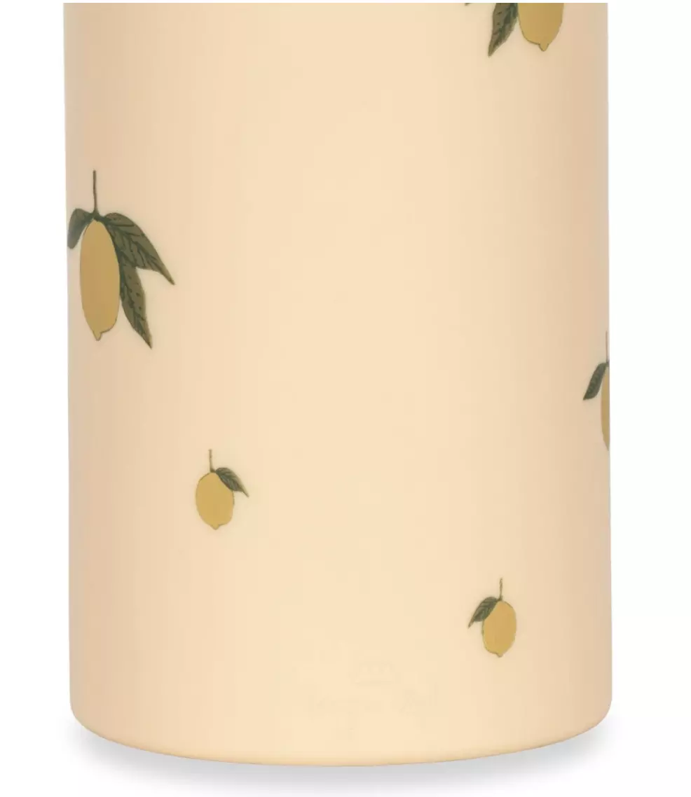 Gourde à paille en silicone avec un imprimé citron, elle est facile à emporter partout et pourra suivre votre enfant lors de toutes ses balades.