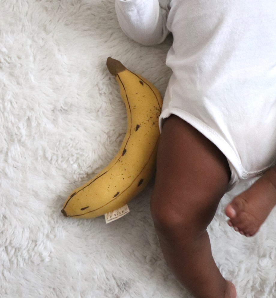 Tissu 100% coton biologique certifié GOTS ; Rembourrage en fibres silliconnées ; La banane favorise l’éveil des plus petits, grâce au hochet situé à l’intérieur. ; Prise en main facile, même pour de toutes petites mains ! ; Le poireau se compose d’une base ferme, et de trois feuilles molles. ; Attention ! : chaque poireau est unique, dû au procédé de coloration aléatoire.