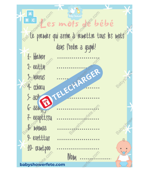 Découvrez une idée de jeu baby shower originale pour votre baby shower! Fille, garçon ou surprise, cette activité est adaptée à tous les thèmes. Un jeu idéal pour les amateurs de jeux de mots et mots mêlés , puisqu’il s’agit de remettre dans l’ordre 10 mots ayant un rapport avec l’univers de bébé. Retrouvez d’autres idées de jeux baby shower sur notre site.