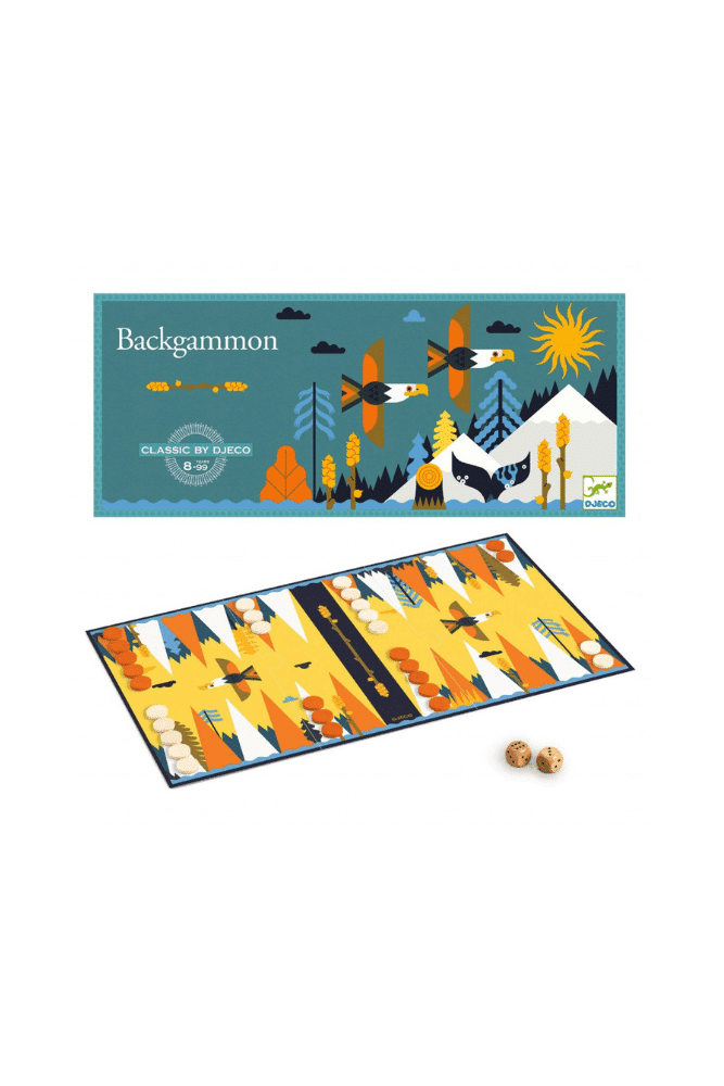 Découvrez le Backgammon, un jeu de plateau traditionnel pour 2 joueurs à partir de 8 ans avec de belles illustrations colorées.