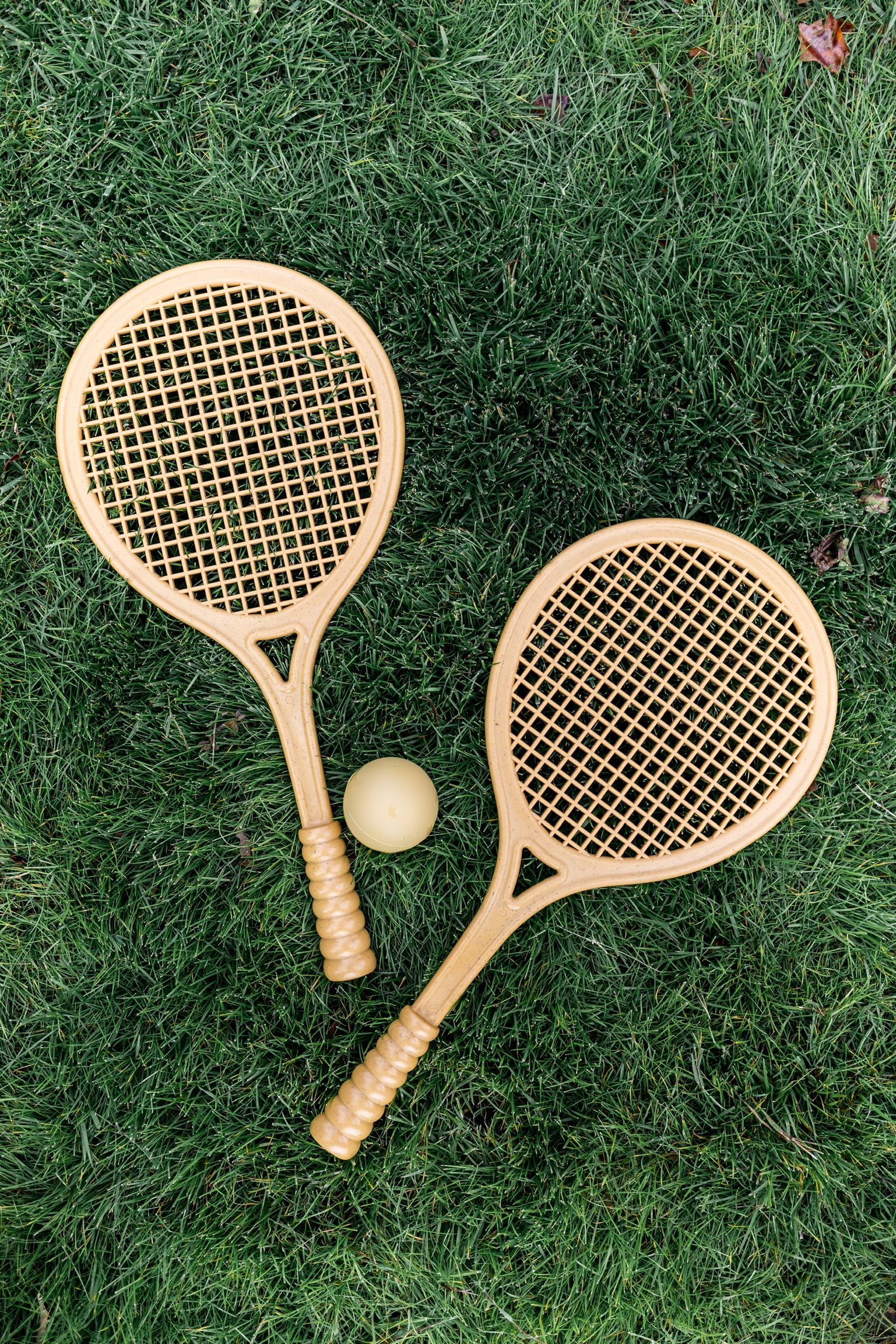 Découvrez le kit de tennis de jardin par Liewood, il est composé de 2 balles en caoutchouc et de 2 raquettes.