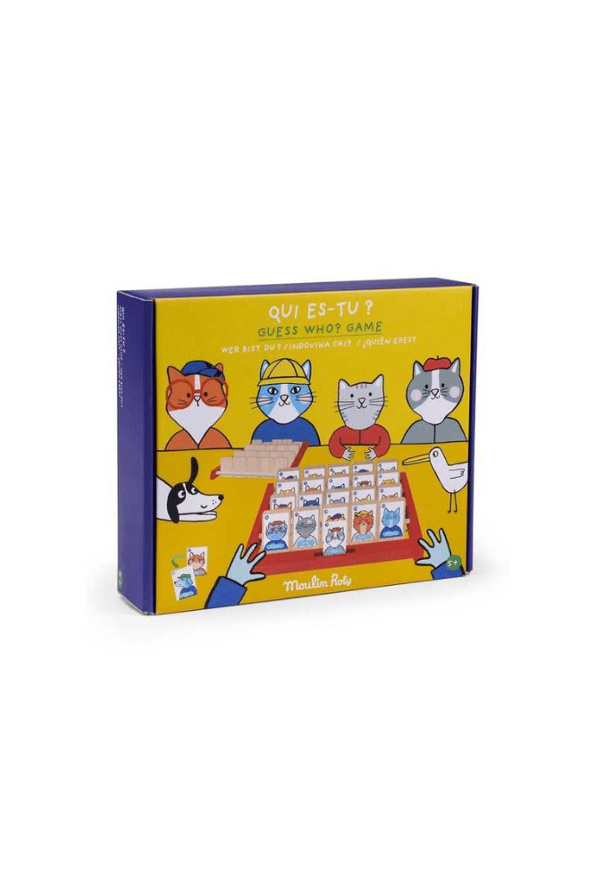 Découvrez le jeu Qui es-tu ? de Moulin Roty, un jeu de société en bois pour 2 joueurs à partir de 4 ans. Moulin Roty réinvente le célèbre jeu « Qui est-ce?  » avec ce jeu modulaire en bois. Avec ses 40 cartes illustrées recto-verso, vous avez le choix entre la famille « Chat » ou la famille « Chien » pour des parties pleines de rebondissements. Faites preuve d’astuce en posant les bonnes questions à votre adversaire pour démasquer le plus de personnages possible. Un jeu de questions et de déductions qui enchantera aussi bien les petits que les grands!