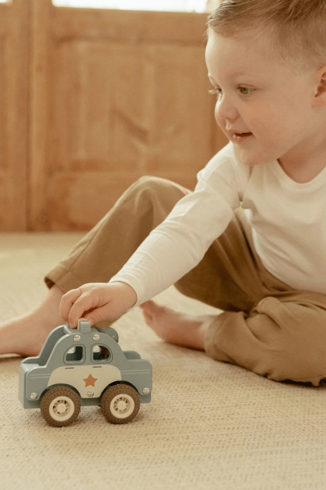 Découvrez la voiture de police en bois avec des roues en caoutchouc pour des trajets en douceur et une courageuse agente de police au volant. Votre enfant jouera des poursuites palpitantes et il mettra les bandits derrière les barreaux. Ce jouet voiture de police est parfait pour les jeux de rôle. Pour continuer l’aventure, découvrez le camion de pompier et l’ambulance.