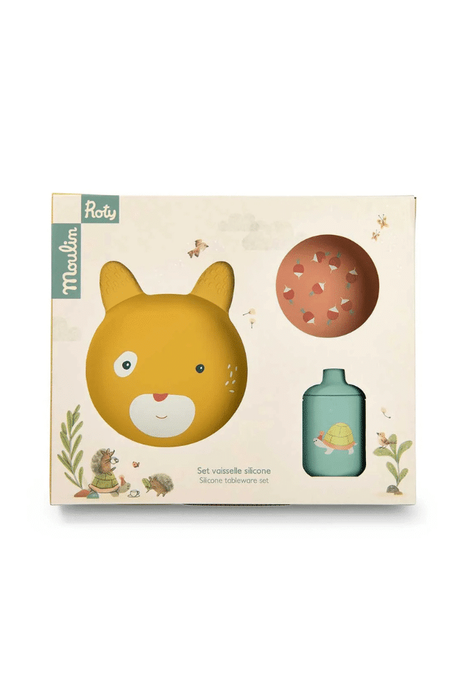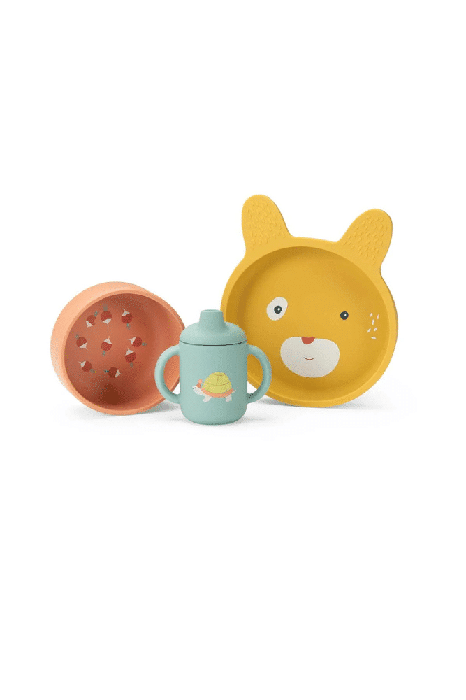 Découvrez ce kit de vaisselle en silicone pour votre petit ! Manger comme les grands devient super facile. Comprend un bol, une tasse à anses et une assiette aux couleurs des 3 petits lapins.