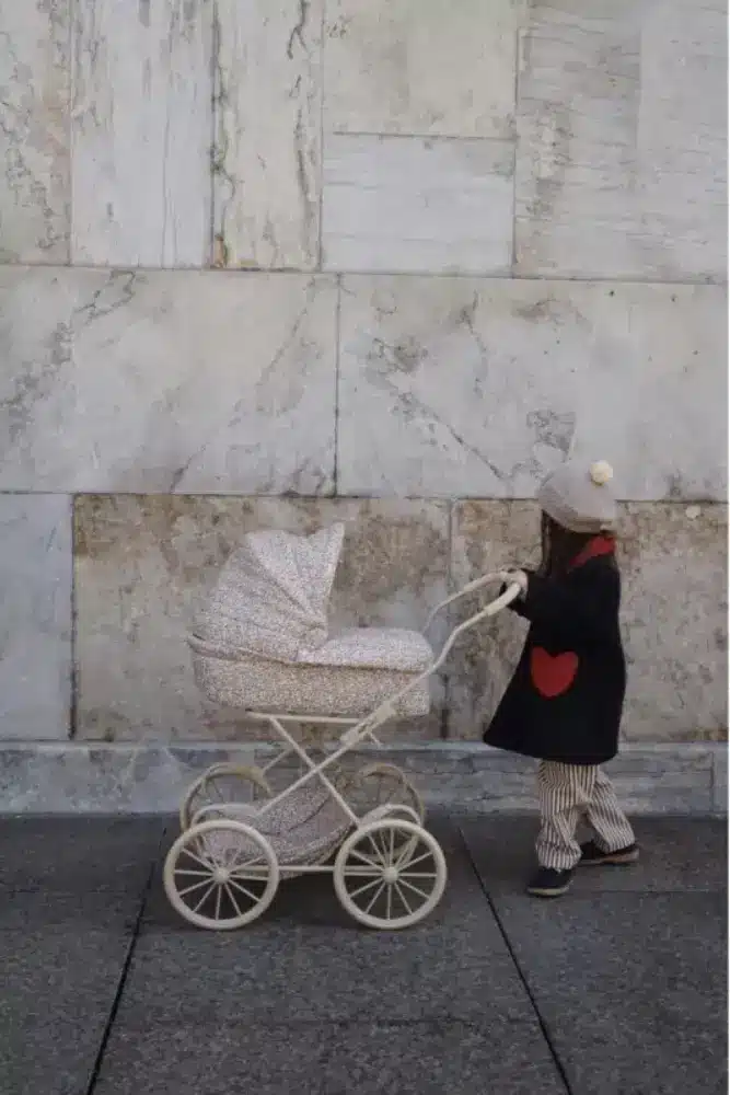 La poussette landau pour poupée au style vintage, avec quatre grands roues en EVA pour une meilleure stabilité. Avec un tissu imprimé matelassé et un matelas en 100% coton bio. La poussette est facile à plier et à ranger.