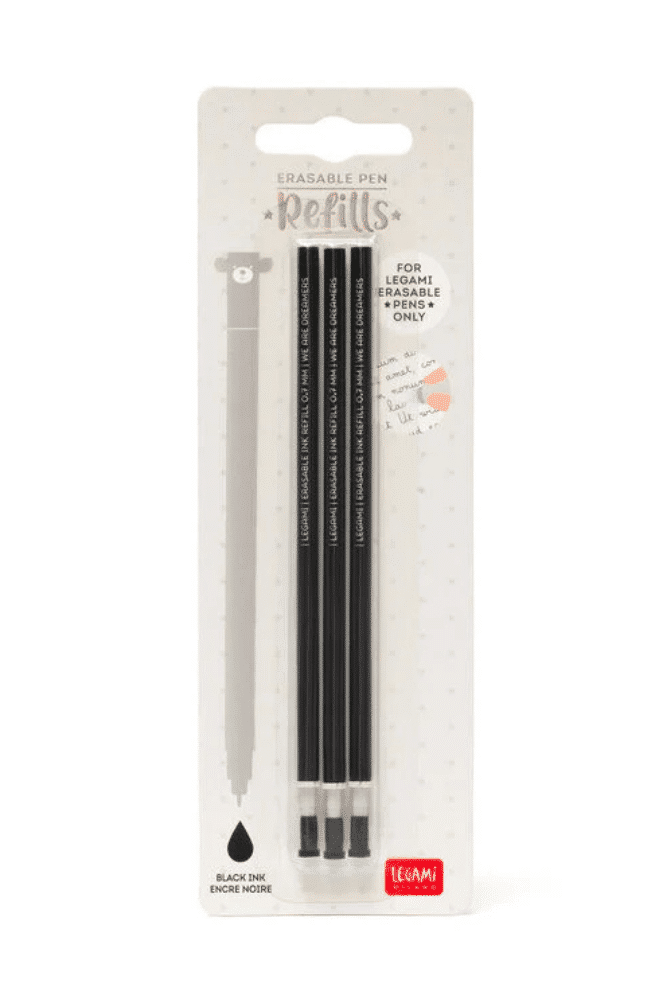 Votre stylo effaçable Legami est à court d’encre ? Pas de panique, ces recharges noires sont là pour vous sauver ! Avec ce lot de 3 recharges, vous pouvez continuer à écrire, effacer et recommencer autant de fois que vous le souhaitez. Pratique pour l’école, les devoirs ou les petits mots rigolos !