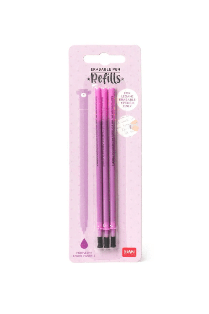 Prolonge l’expérience d’écriture avec ce lot de 3 recharges à encre violette, compatible avec les stylos gel effaçables Legami. Pour continuer à écrire avec style et toujours sans rature !