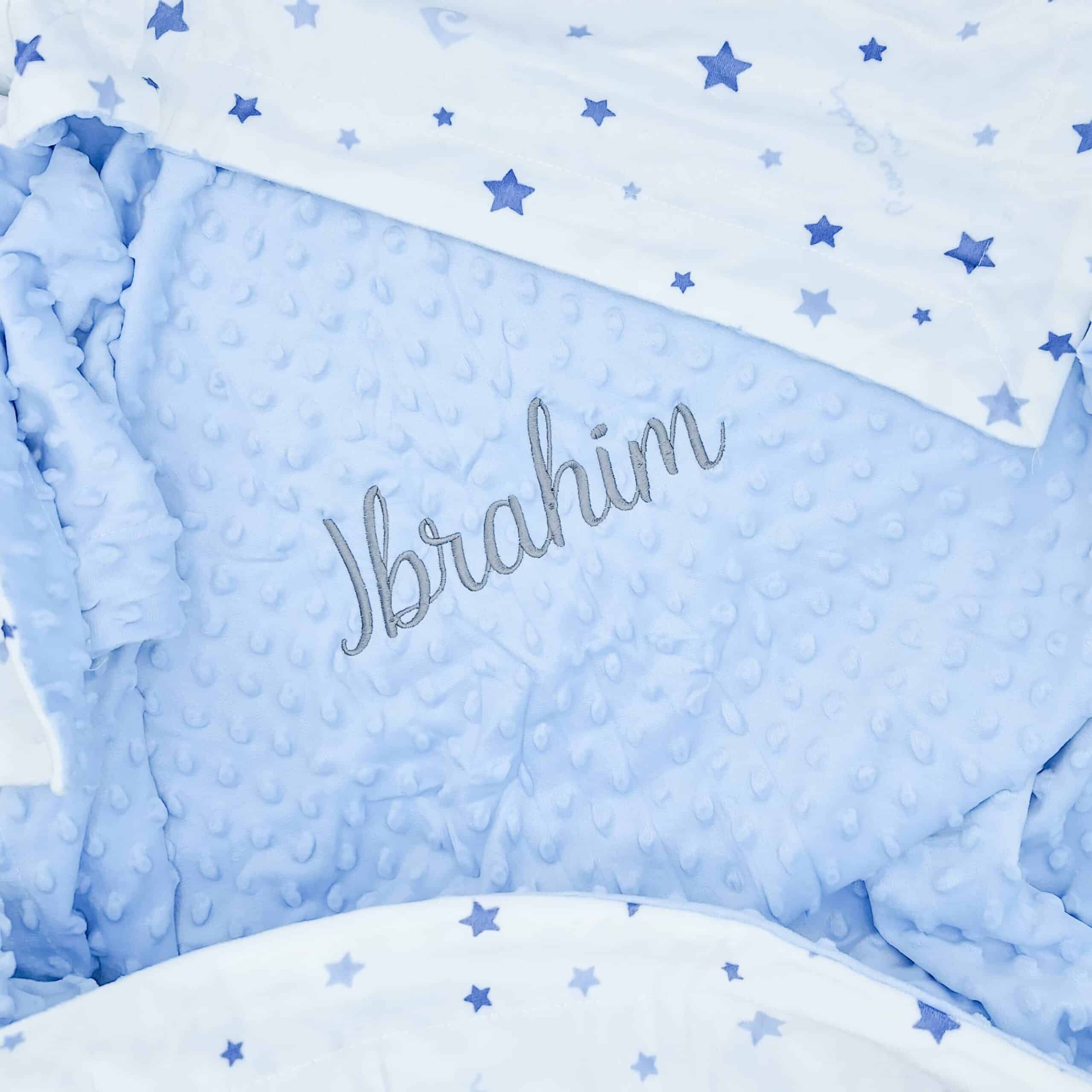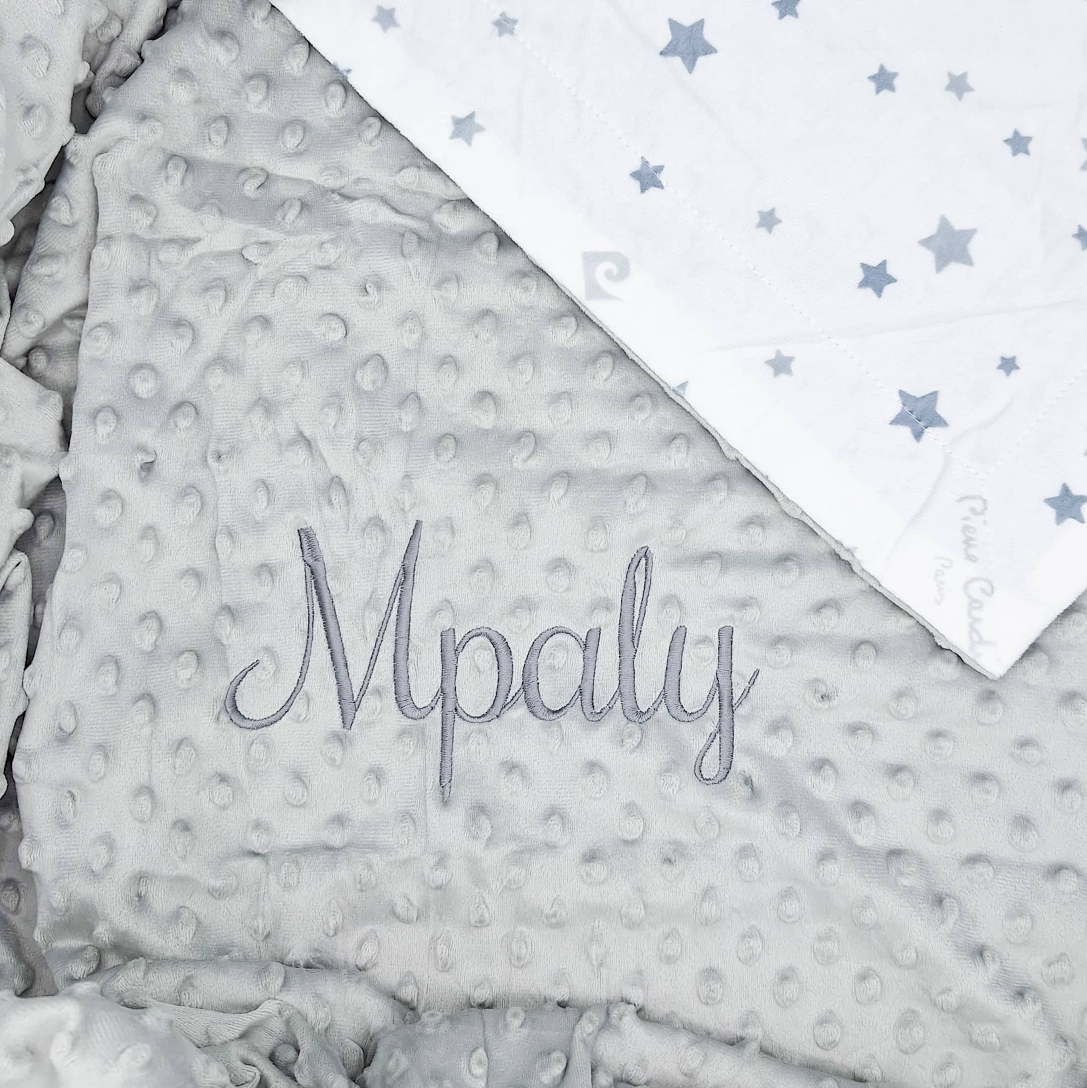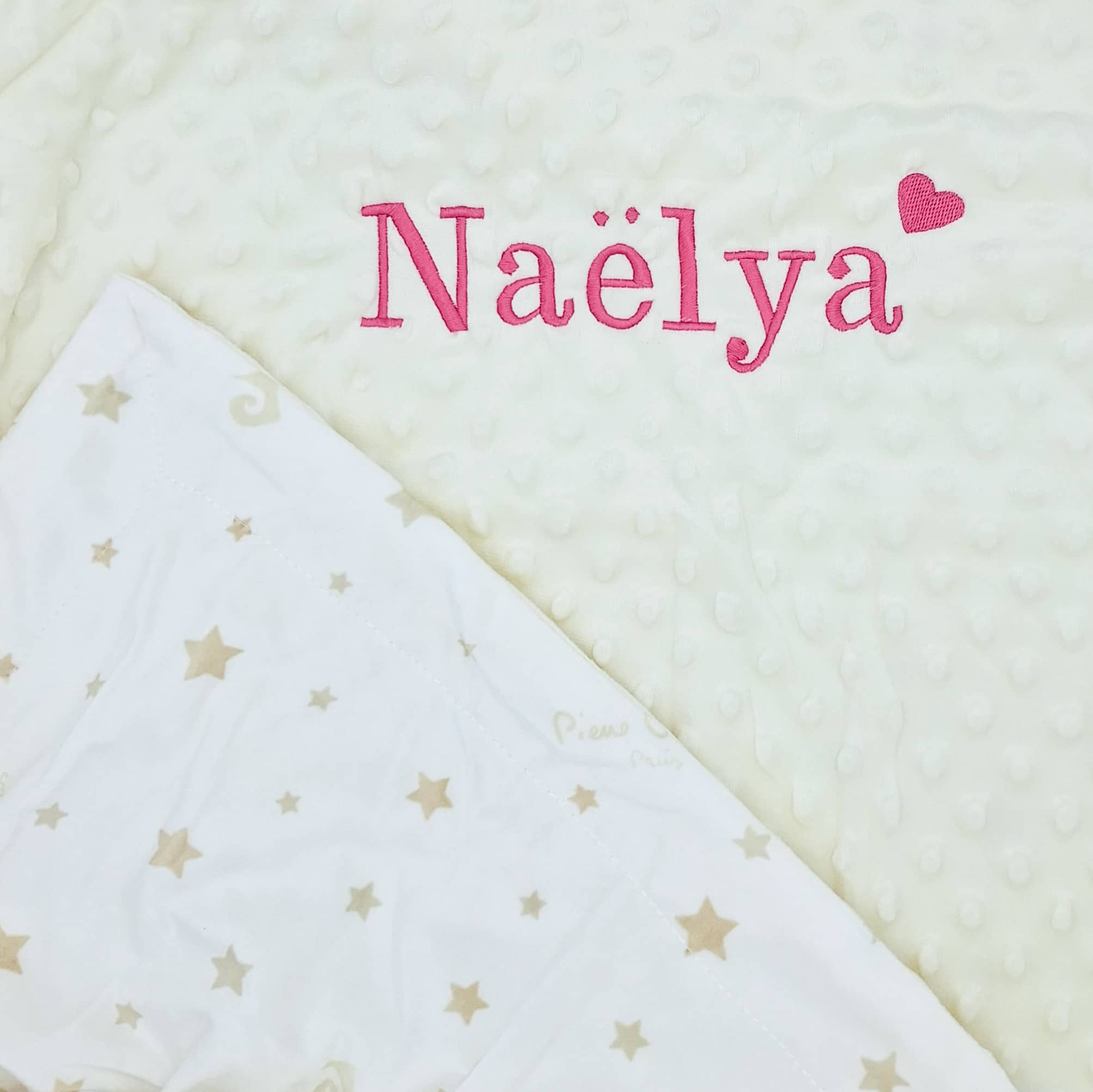 Couverture doublée de grande taille : 80 x 110 cm Qualité haut de gamme Une face bulle et une face lisse avec motifs étoiles 100% polyester Broderie personnalisée avec fils certifiés oeko-tex 🪡 Le motif sera brodé de la même couleur que le prénom. Photos non contractuelles : les couleurs peuvent être légèrement différentes selon les arrivages et le réglage de votre moniteur. Sauf indication contraire, le prénom sera brodé au centre.