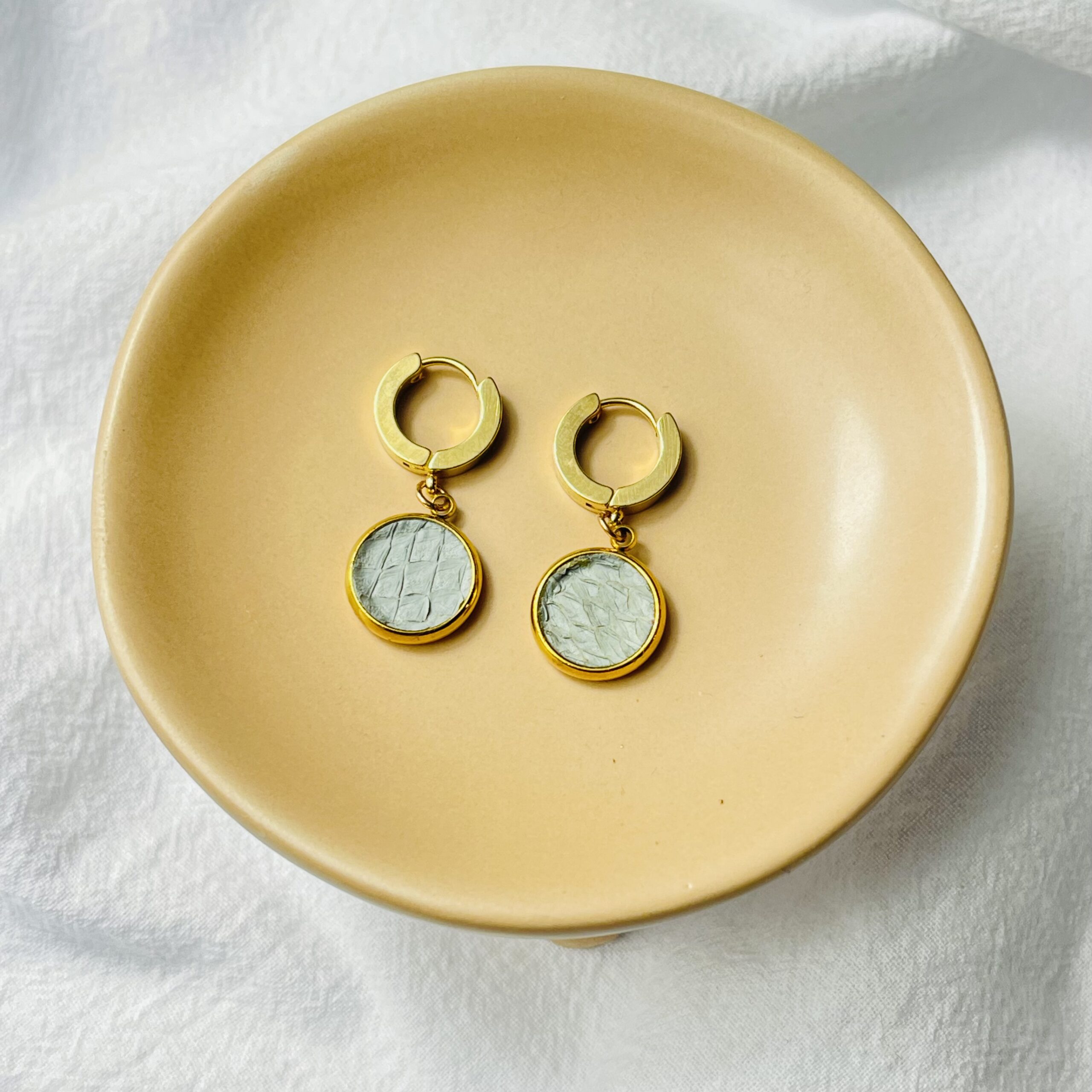 Découvrez l’élégance des boucles d’oreilles Lila, conçues en acier inoxydable doré et en cuir de poisson. Leur design discret mais remarquable fera de ces boucles d’oreilles un incontournable de votre collection. Choisissez l’authenticité d’un bijou fait main, adapté à chaque instant.