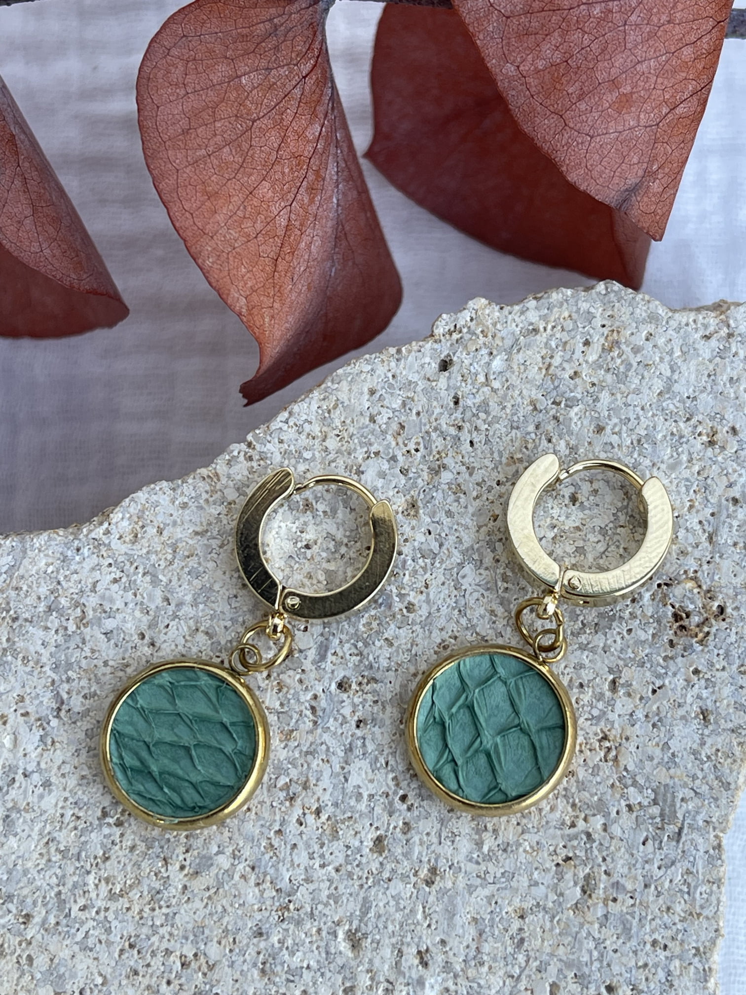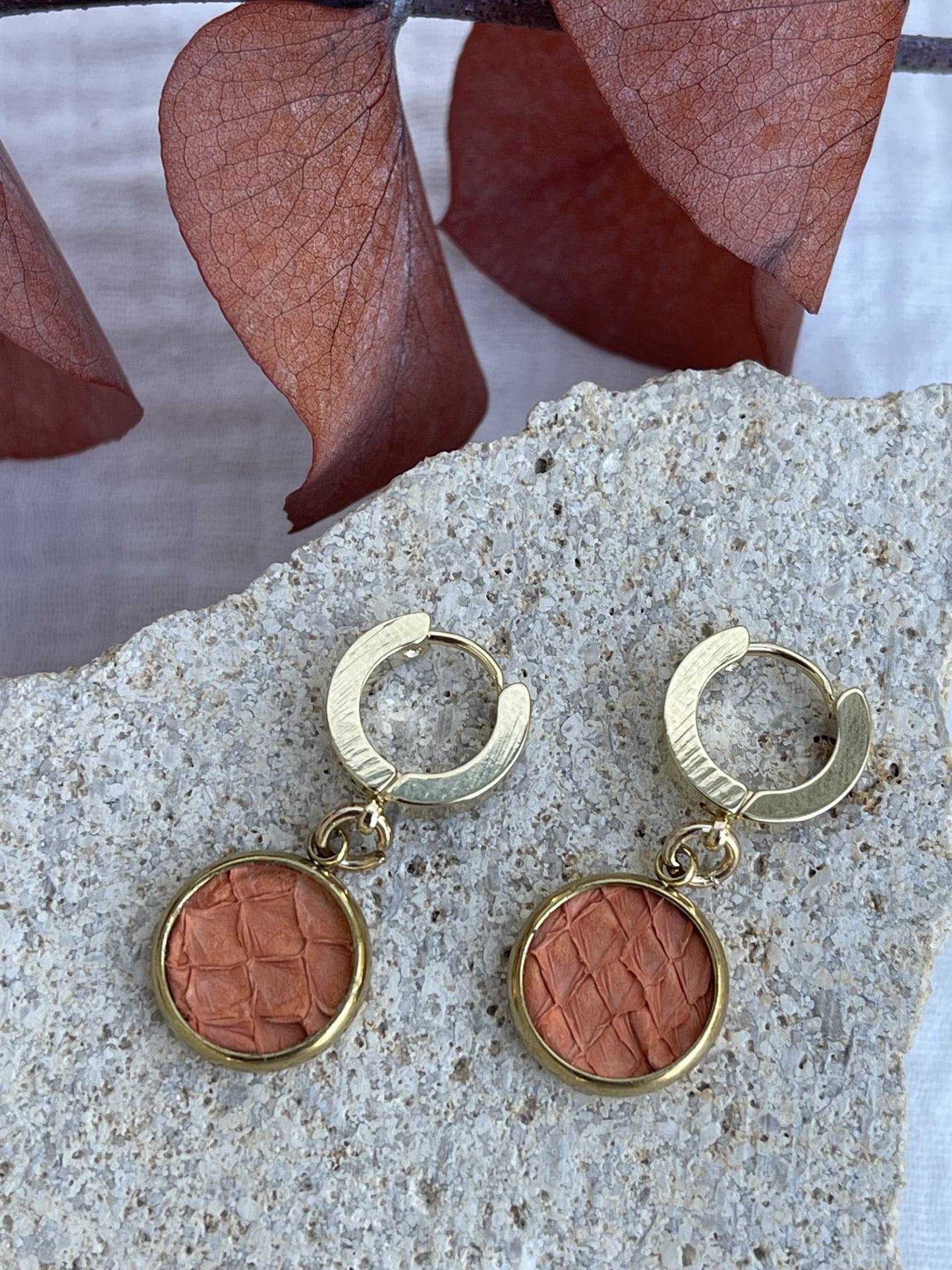 Ces boucles d’oreilles en acier inoxydable sont confectionnées à partir de peaux de saumon issues de l’agroalimentaire et transformées par l’entreprise ICTYOS.