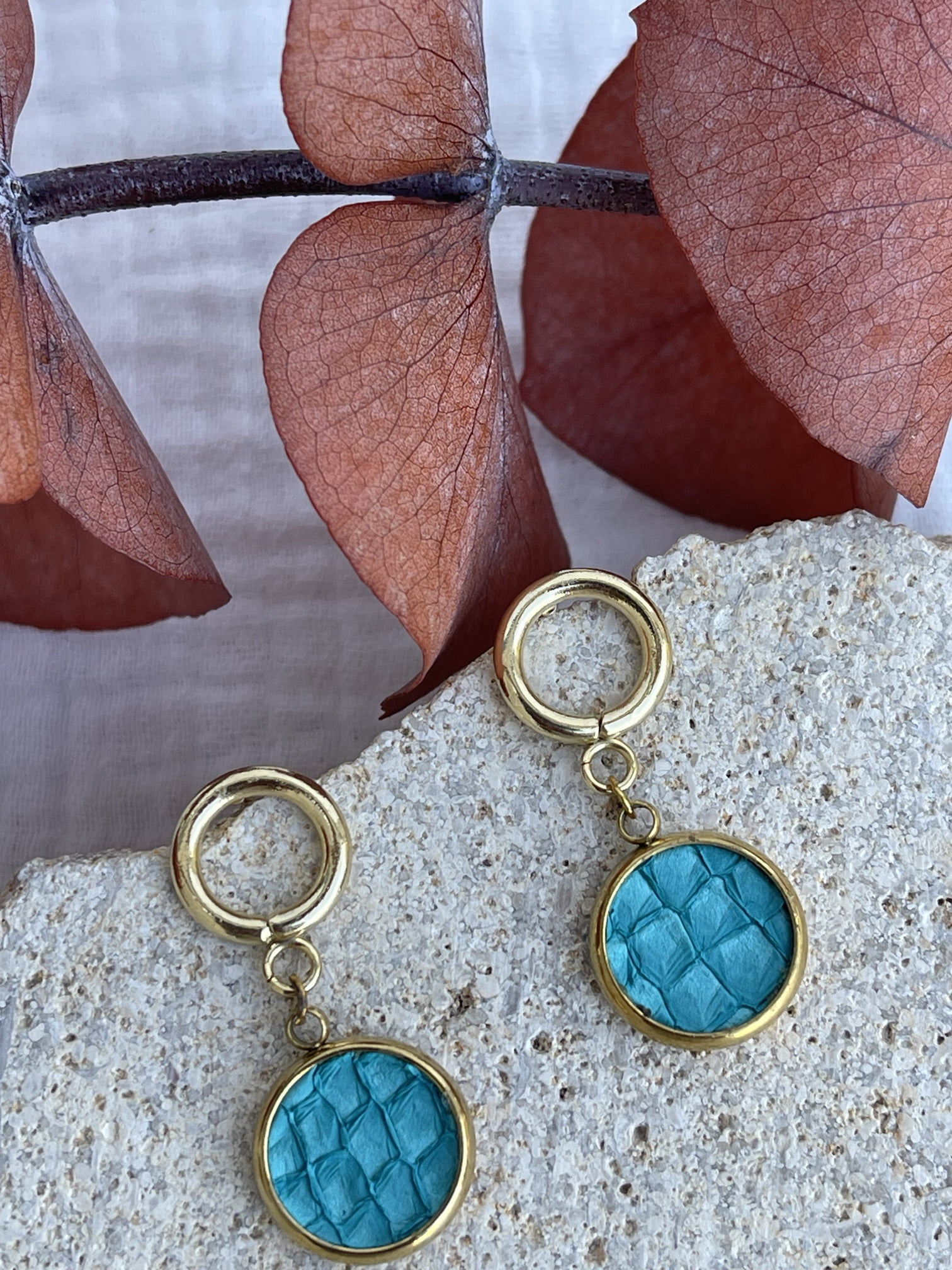 De petits anneaux en acier inoxydable doré assortis à une médaille réalisée à partir de cuir de poisson… Le combo parfait pour allier la discrétion au raffinement. Ces boucles d’oreilles Lisa deviendront votre bijou incontournable pour vous accompagner avec style au quotidien. Elles seront également cette petite touche finale qui sublimera à la perfection vos plus belles robes de soirée. Faites le choix d’un bijou fait main, idéal en toutes circonstances.