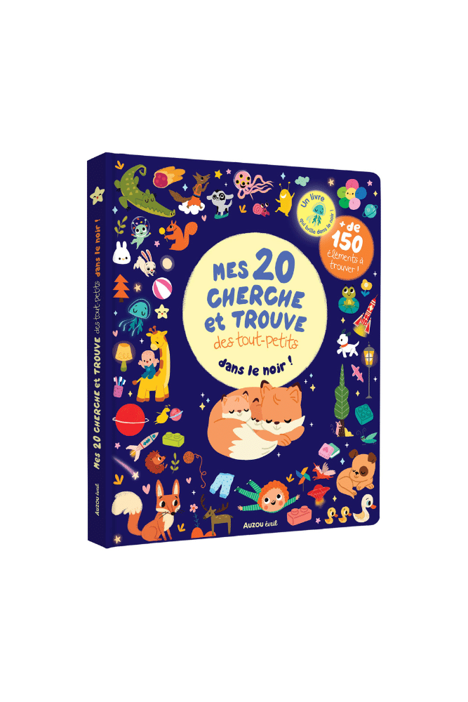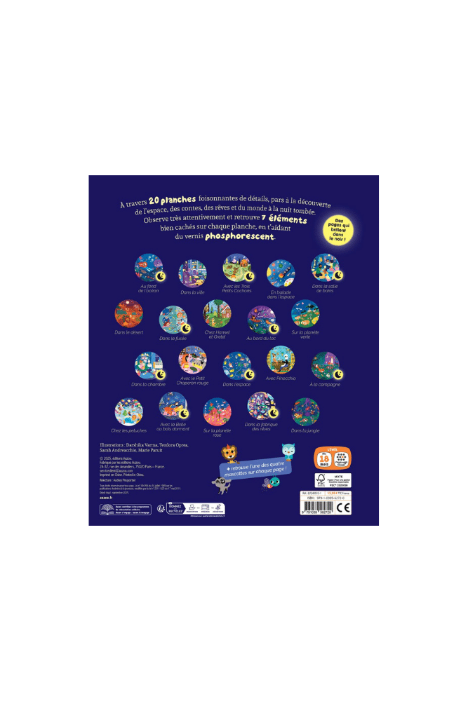 Plongez au cœur de 20 magnifiques scènes pleines de détails et partez explorer les univers du sommeil, des contes, de l’espace et de la nuit. Ouvrez grand les yeux : 7 objets et une mascotte se sont cachés dans chaque image ! Et surprise… 10 planches s’illuminent dans le noir grâce à un vernis phosphorescent pour une aventure qui continue même la lumière éteinte.