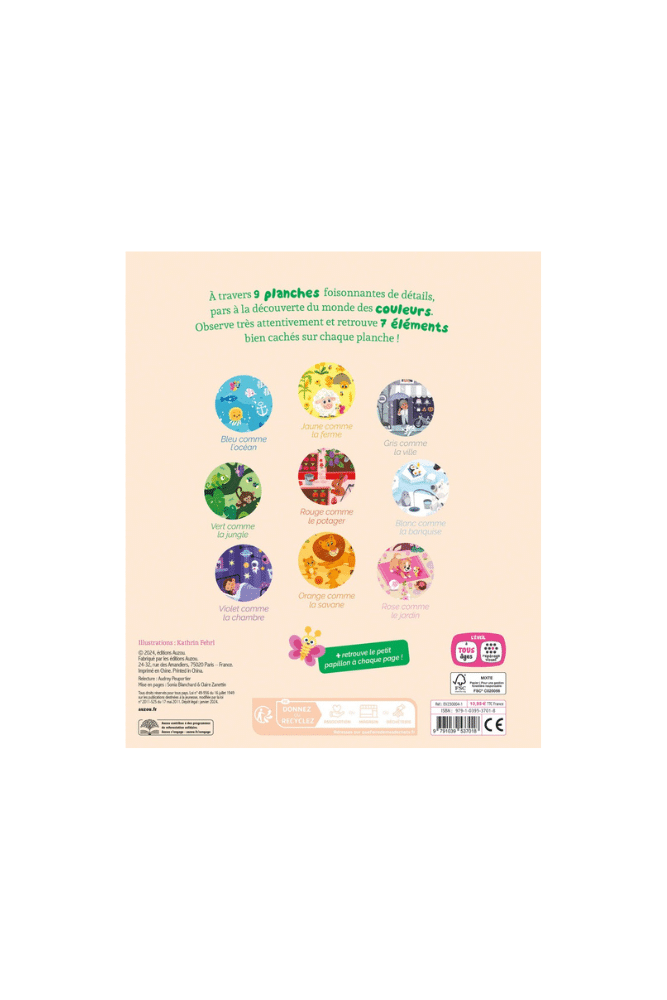 À travers 9 grandes planches riches en détails, les enfants partent à la découverte des couleurs ! En observant attentivement, ils doivent retrouver 7 éléments cachés et la mascotte sur chaque scène. Les 9 univers à explorer : Bleu comme l’océan Jaune comme la ferme Gris comme la ville Vert comme la jungle Rouge comme le potager Blanc comme la banquise Violet comme la chambre Orange comme la savane Rose comme le jardin.