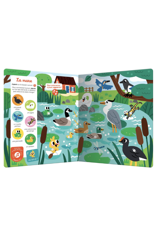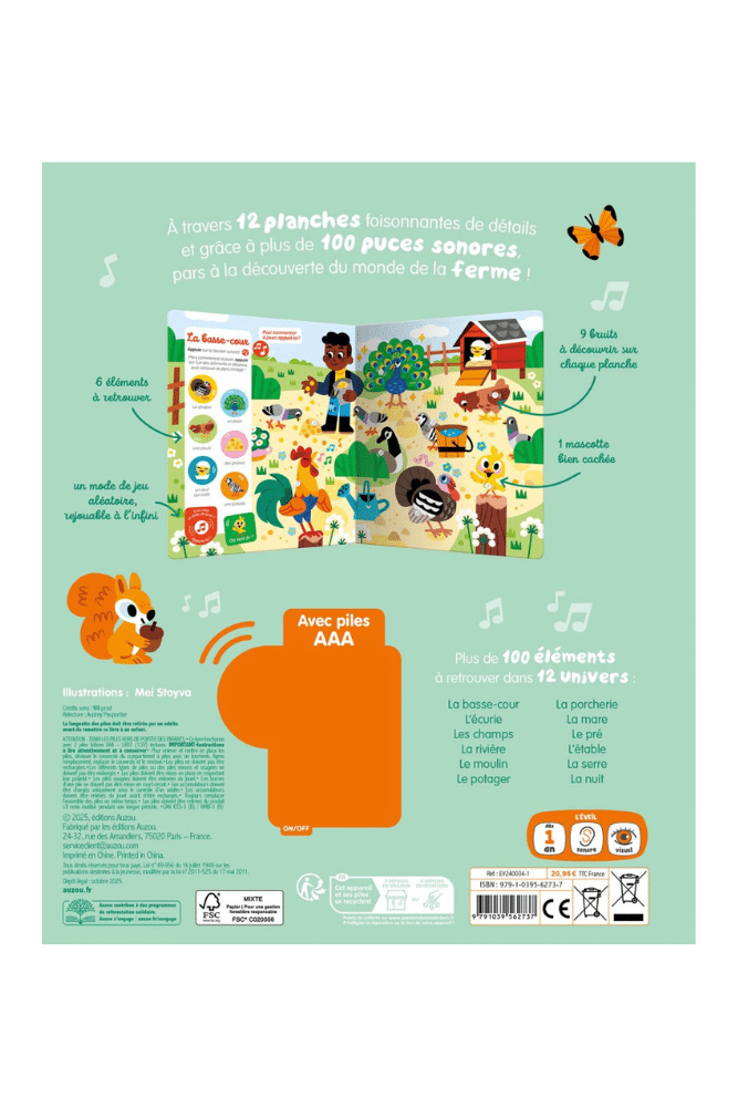 Découvrez ce nouveau cherche et trouve sonore. Votre tout-petit explore le monde de la ferme à travers 12 planches foisonnantes de détails et près de 100 sons à découvrir. Sur chaque double page, il observe et écoute attentivement pour retrouver 6 animaux et une mascotte qui se cache dans chaque univers : la basse-cour, l’étable, le pré… Sur chaque planche, un mode de jeu aléatoire est disponible : il faudra retrouver l’animal ou l’élément auquel correspond le bruit entendu ! Attention aux 2 éléments mystères qui se sont glissés dans le jeu…