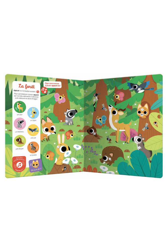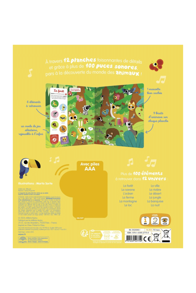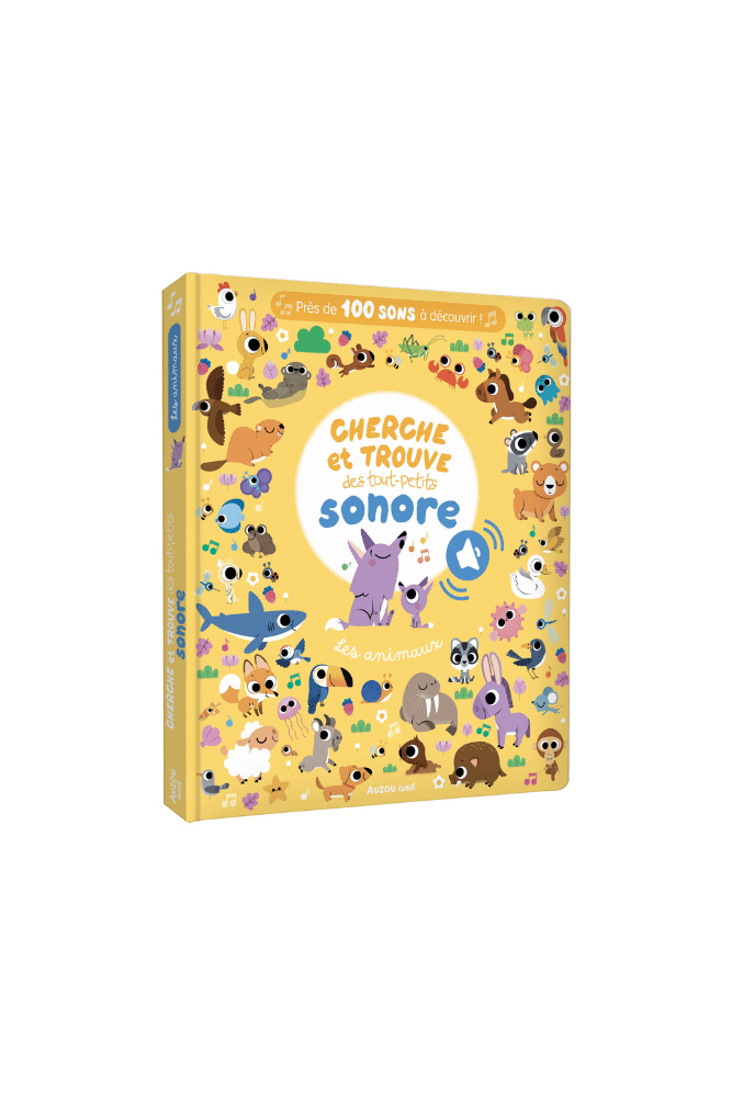 Découvrez ce nouveau Cherche et trouve sonore ! Votre tout-petit explore le monde des animaux à travers 12 planches foisonnantes de détails et près de 100 sons à découvrir. Sur chaque double-page, il pourra observer et écouter attentivement pour retrouver 6 animaux et une mascotte qui se cache dans tous les univers : la ferme, la forêt, la savane, l’océan, la nuit … Sur chaque planche, un mode de jeu aléatoire est disponible : en appuyant sur la puce, on entend des cris d’animaux à retrouver dans l’illustration (on retrouve les sons de la liste, mais aussi 2 sons mystères…