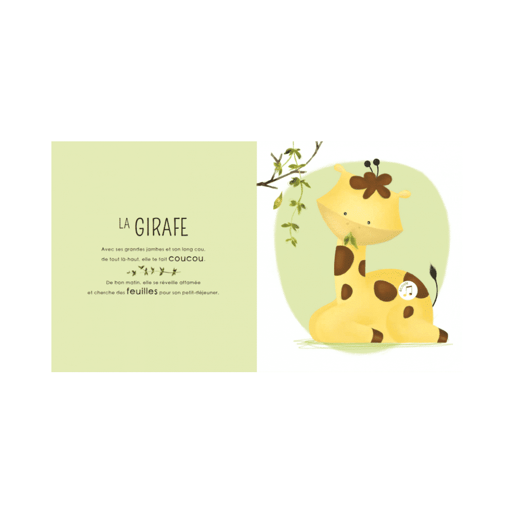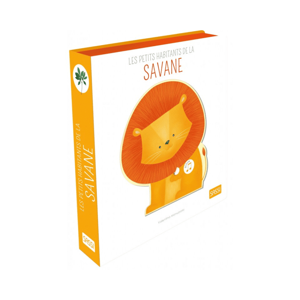 Livre d’éveil – Sassi Un livre sonore aux délicates illustrations pastel et aux douces rimes pour faire découvrir les cris des animaux aux tout-petits. La savane africaine abrite tout plein d’animaux : découvre qui ils sont en feuilletant les pages de ce livre et appuie sur les boutons pour écouter leurs cris.
