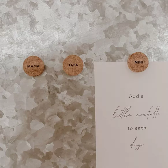 Trois aimants en chêne pour toute la famille ! Idéal pour garder une trace de tout sur le réfrigérateur ou le tableau magnétique.