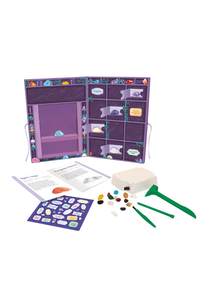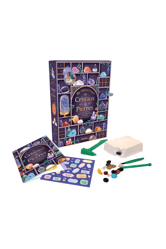 Découvrez ce coffret de cristaux et de pierres. Grâce à vos outils, retrouvez les pierres naturelles dans le bloc d’argile. Rangez vos pierres dans votre bibliothèque et personnalisez-la grâce aux autocollants. Un livret détaillé pour y retrouver des informations passionnantes et de quoi noter tout ce que vous souhaitez.