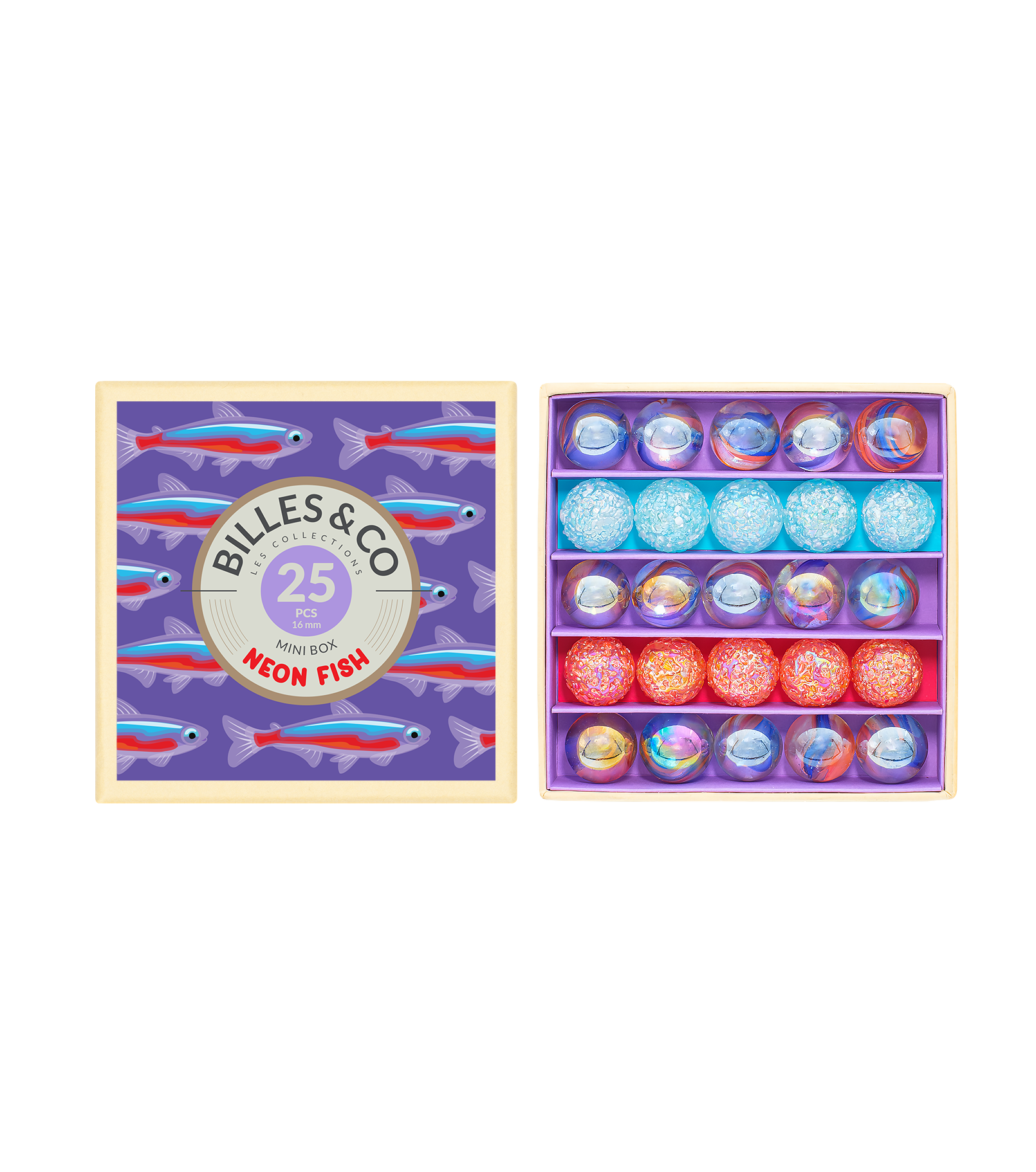 Coffret de 25 billes Neon Fish contenant 3 variétés de billes : 25 billes de 16 mm