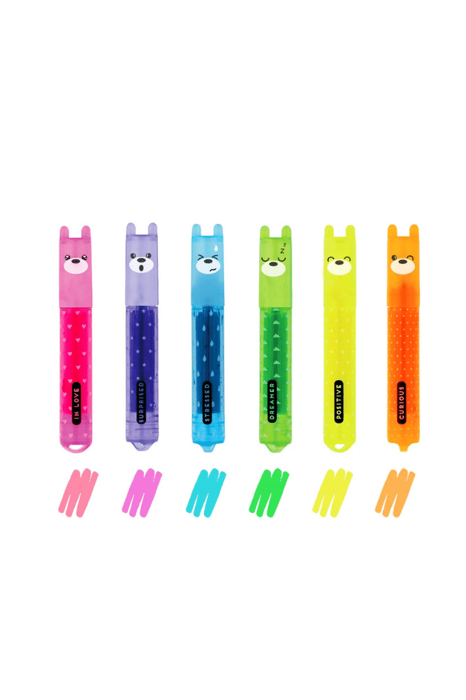 Découvrez le set de 6 surligneurs sur le thème Ourson aux couleurs vives. Un format de poche à sortir en cas de besoin ! Surligneurs à base d’eau.
