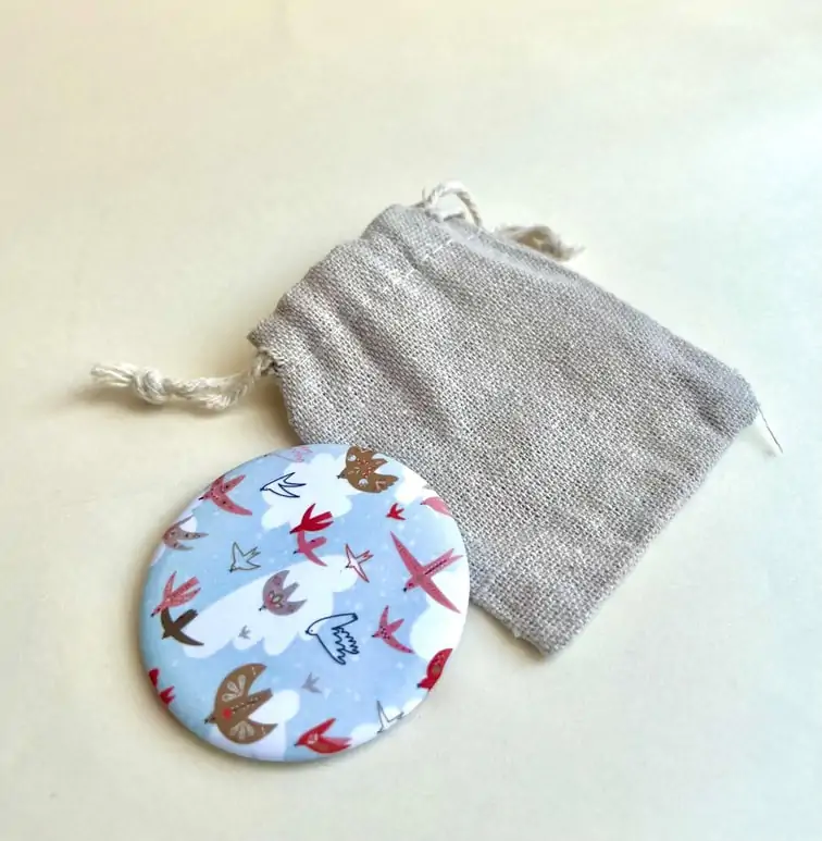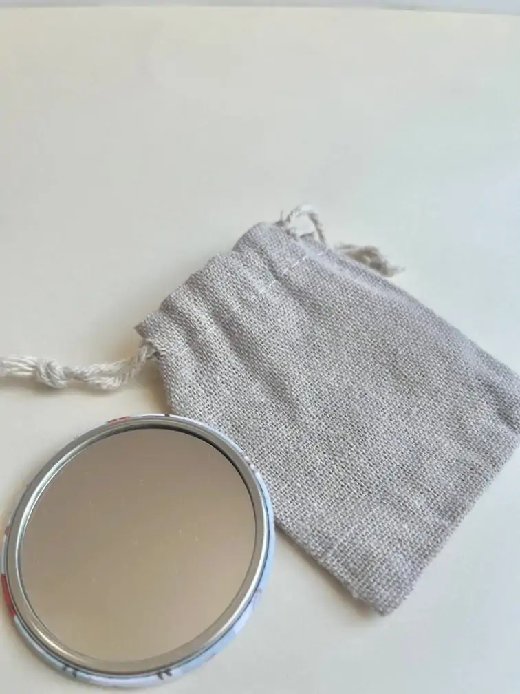 Un miroir de poche élégant et pratique, au design doux et poétique. Fabriqué en France, livré dans un pochon en tissu. Idéal pour un cadeau maman.