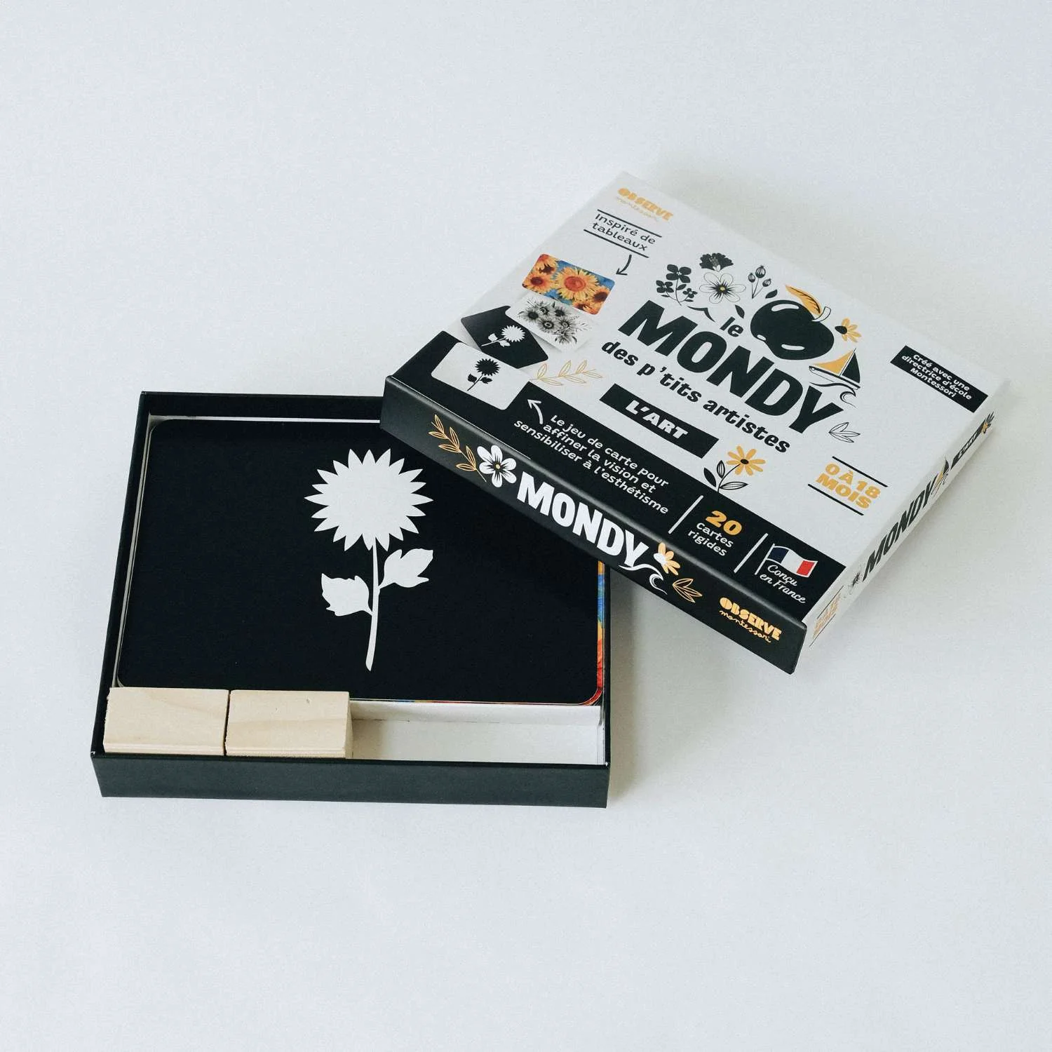 Coffret de 20 cartes conçu pour accompagner en douceur le raffinement de la vue et sensibiliser l’enfant à la beauté. Créé par une Directrice d’École Montessori AMI. DÈS LA NAISSANCE RAFFINEMENT VISUEL & ART La vision des nourrissons évolue considérablement au cours des premiers mois de leur vie. À la naissance, la vue est le sens le moins développé. Ce coffret est spécialement conçu pour accompagner en douceur le raffinement de la vue et sensibiliser l’enfant à l’esthétisme et à la beauté selon la pédagogie de Maria Montessori. DE 0 À 2 ANS LE RAFFINEMENT DE LA VUE De 0…