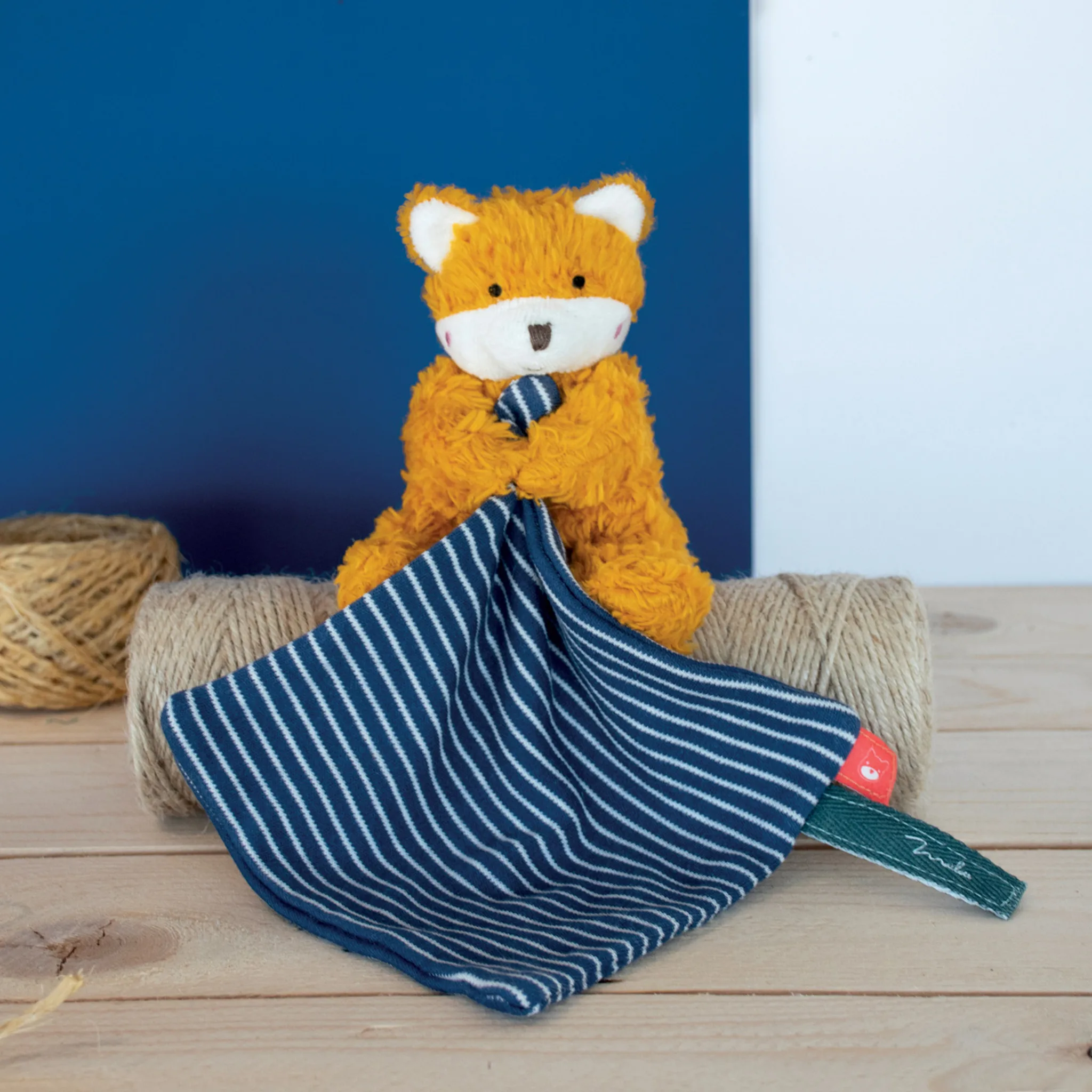 Ce Pantin renard avec Doudou en coton Bio et rembourré de fibres recyclées est fabriqué en France. Façonné dans notre Atelier de fabrication de peluches d’exception en Bretagne, il a été cousu à la main par des couturières expertes, passionnées et rares détentrices du savoir-faire français. Ce Doudou renard, avec sa belle couleur curry respire la vitalité. Créé dans une peluche 100% coton bio qui révèle son petit style bohême très tendance, il est mixé à de rassurantes rayures marine en jersey 100% coton bio. Il est aussi décoré de différentes étiquettes et nouettes indispensables pour amuser bébé. Doudou made in France / Fabriqué en Bretagne Fabriqué en coton BIO 100% Yeux brodés…