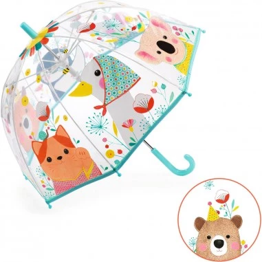 Un parapluie aux couleurs vives illustré d’un décor sur le thème des animaux du monde. Sa transparence permet à l’enfant de voir où il va, et son ouverture manuelle dotée d’un système de protection permet de l’ouvrir et de le fermer sans se pincer les doigts.