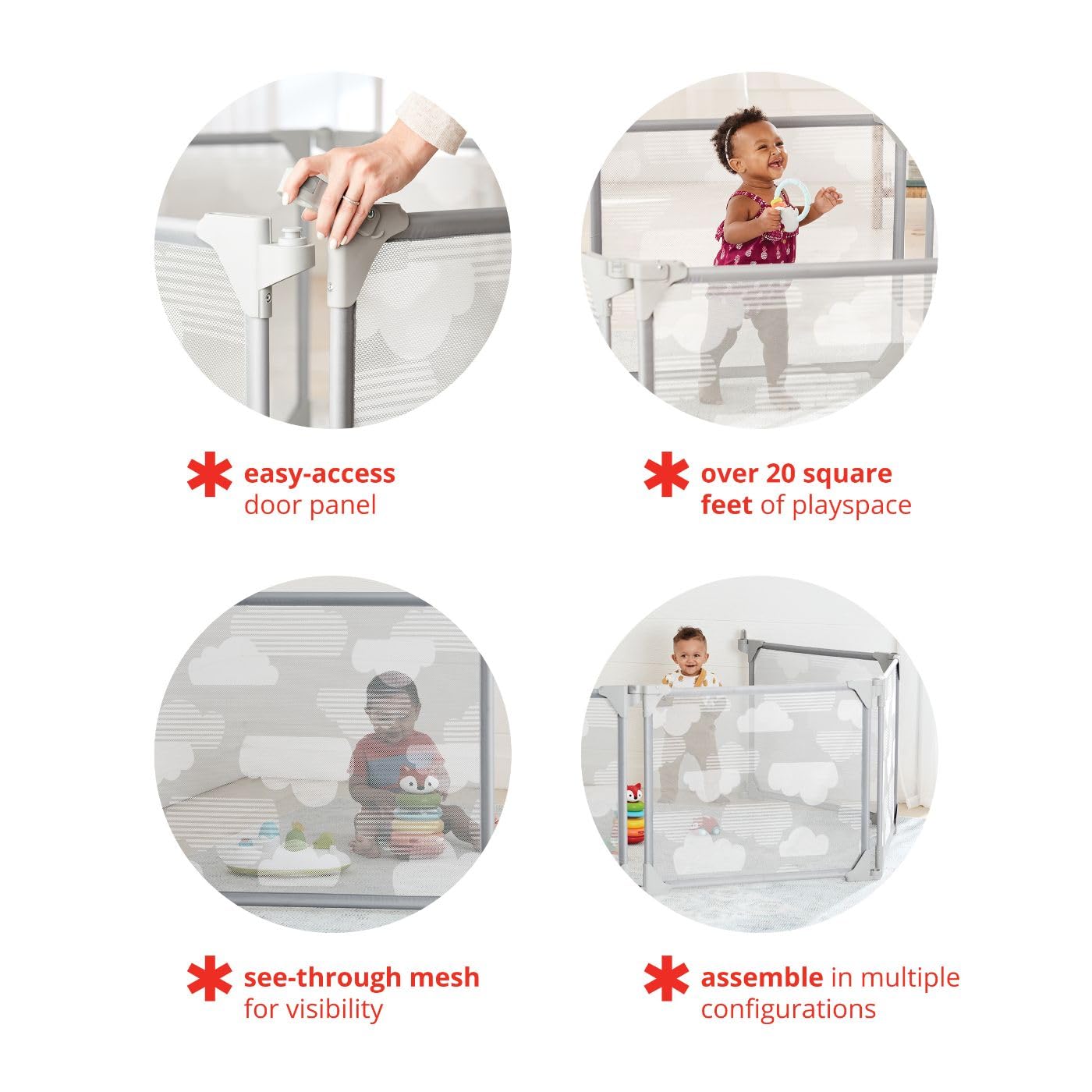 Avec un panneau de porte à charnières offrant un accès facile et une fermeture sécurisée, ainsi qu’un cadre en acier solide, ce parc offre une tranquillité d’esprit aux parents. En créant plus de 20 pieds carrés d’espace de jeu dans différentes configurations, ce parc est un choix pratique et sécurisé pour accompagner la croissance et le développement de votre enfant.