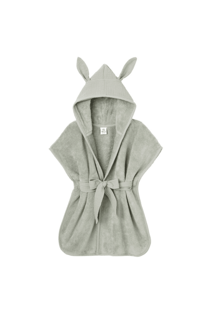 Découvrez ce peignoir de couleur Vert de gris avec capuche agrémentée d’oreilles de lapin. Idéal pour la sortie du bain, piscine ou plage de votre enfant. Le tissu en éponge coton et bambou il est ultra doux et absorbant.