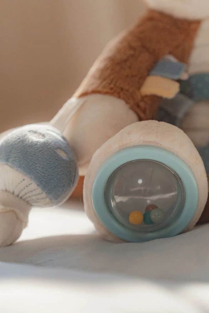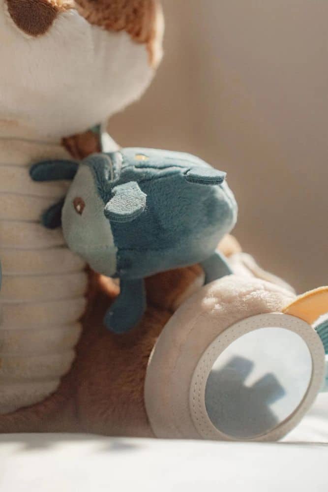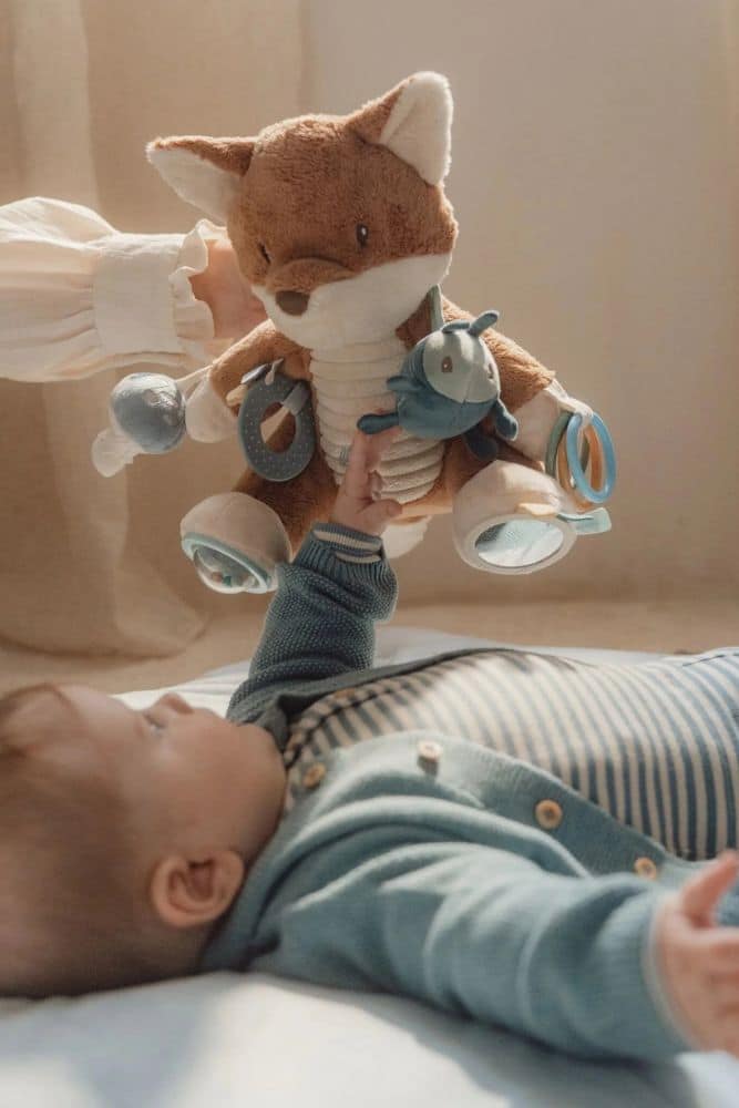 Découvrez ce doux Renard qui fait fureur auprès des bébés. Il cache une multitude d’activités,le bruit de cliquetis, le scarabée crépitant sur l’épaule et les étiquettes, un gland et des champignons pour jouer. Les anneaux autour de la jambe et le miroir sous un pied, des détails pour stimuler la curiosité de votre petit. Et ce mignon renard pourra être câliner à volonté.