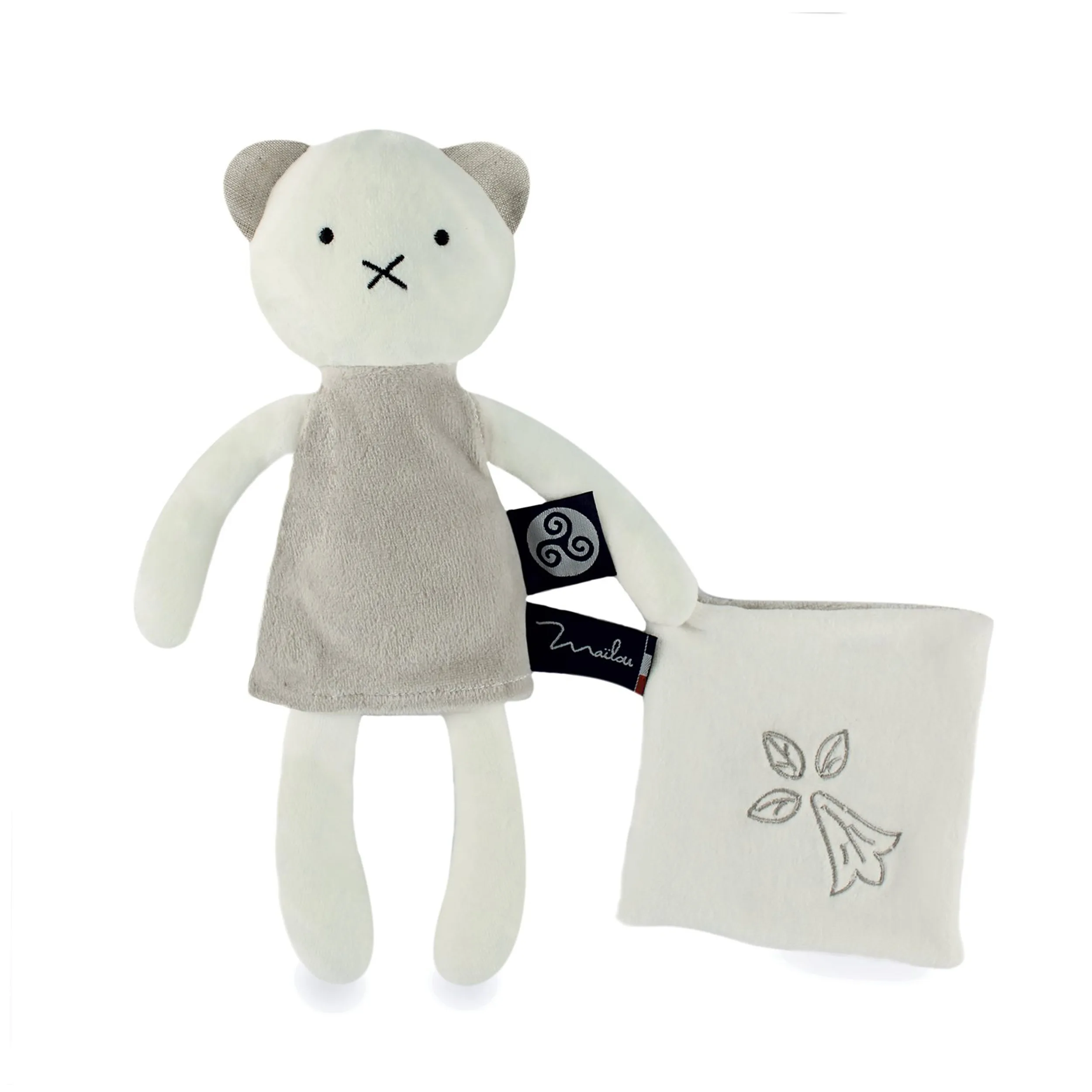 Doux, naturel en coton BIO … cet ourson mignon avec son Doudou mouchoir au look frais et tendre, rappelle qu’en Bretagne on apprécie aussi la terre ferme, préservée et sauvage. De l’hermine brodée détournée façon “végétal” au triskel sur l’étiquette tissée, les symboles de la tradition bretonne se côtoient tout en modernité et fantaisie. Bébé Breizhou pourra s’en donner à coeur joie avec cet adorable pantin ourson. Facile à manipuler, il tient dans sa main un petit Doudou brodé. De quoi câliner, se rassurer et machouiller. Un cadeau idéal dès la naissance, présenté sur une carte en bois réutilisable. Peluche made in France / Fabriqué en Bretagne…