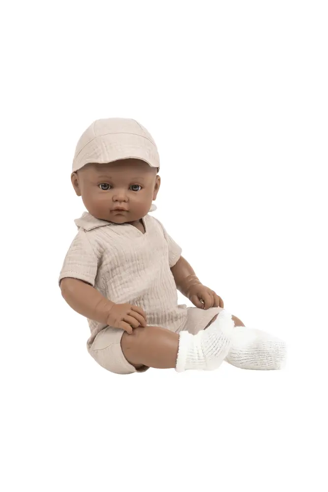 La nouvelle poupée en vinyle de la marque Minikane. De la collection Bambinis, découvrez Augustin habillé dans son joli combinaison Tom beige.