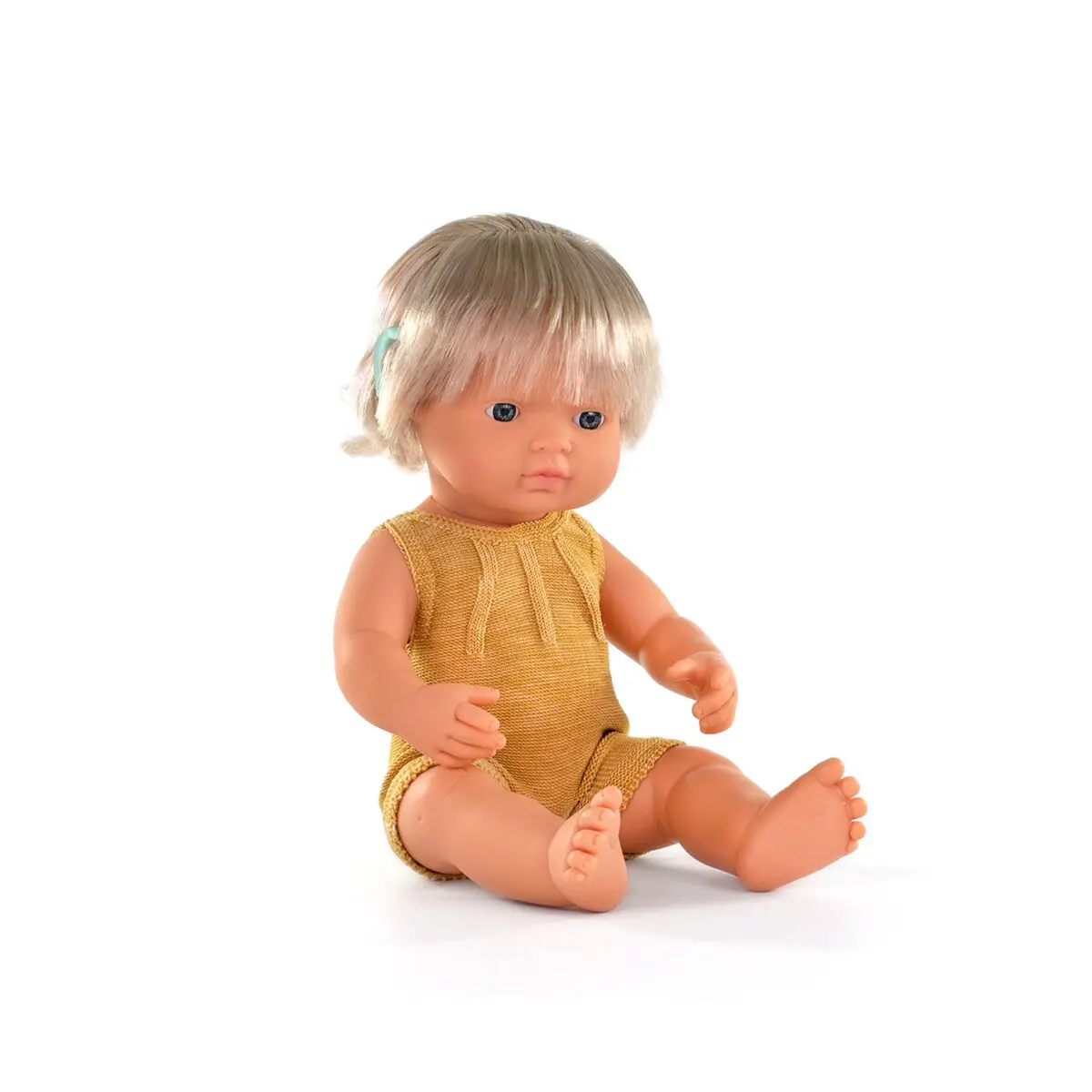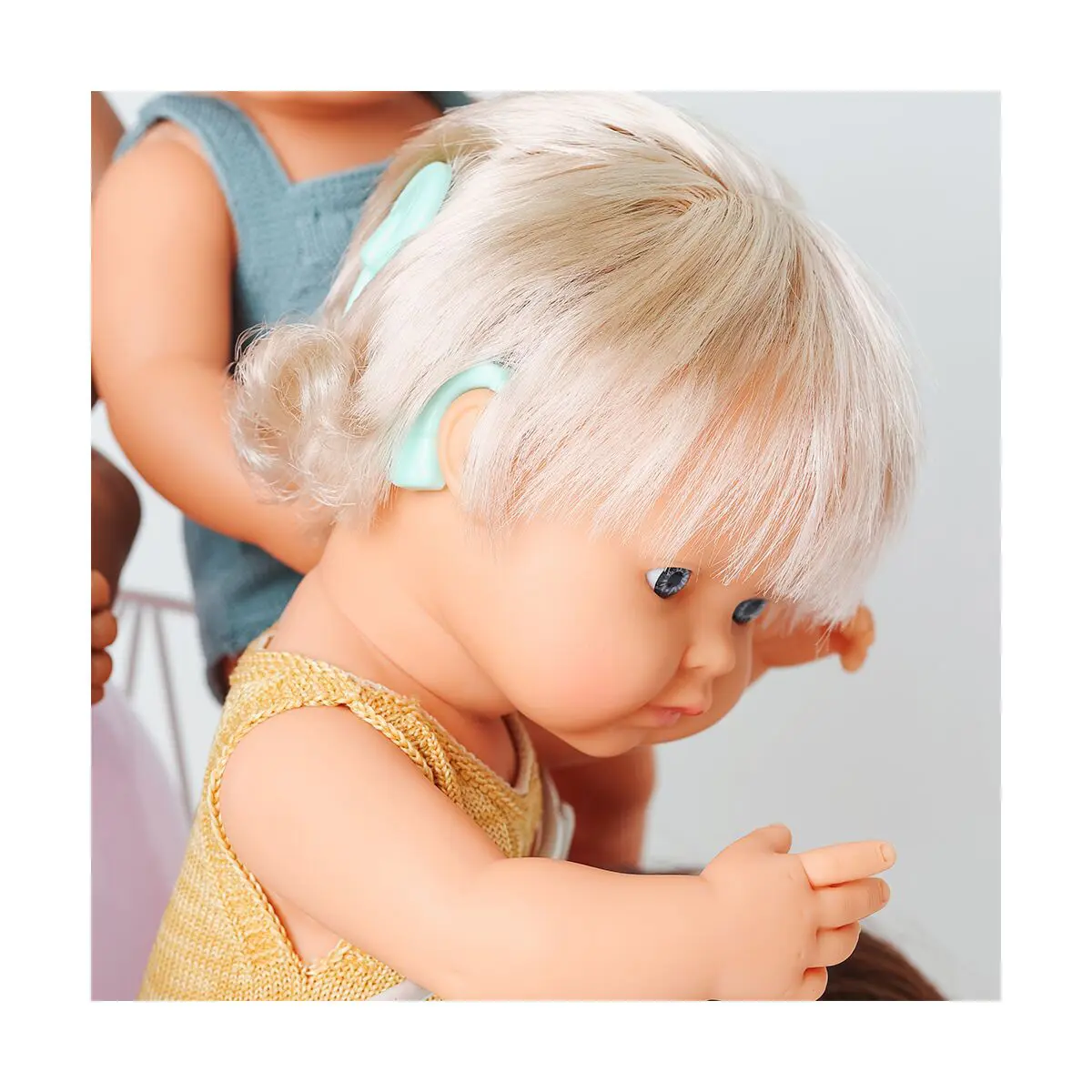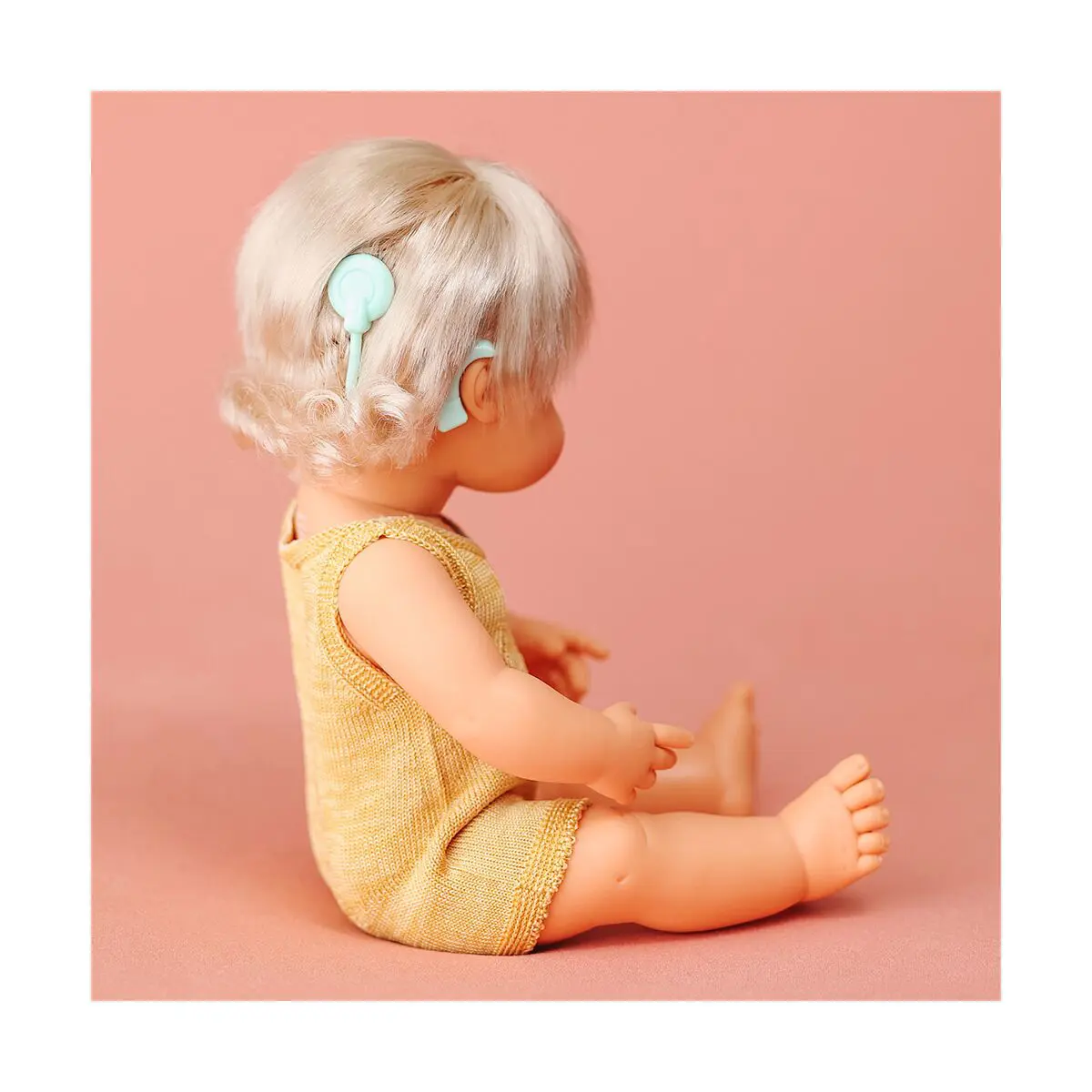 Pas toutes les poupées sont identiques ! Et pour célébrer la diversité, nous vous présentons cette nouvelle poupée avec un implant auditif et des vêtements comme faits à la main, ‘un magnifique coloris ocre.