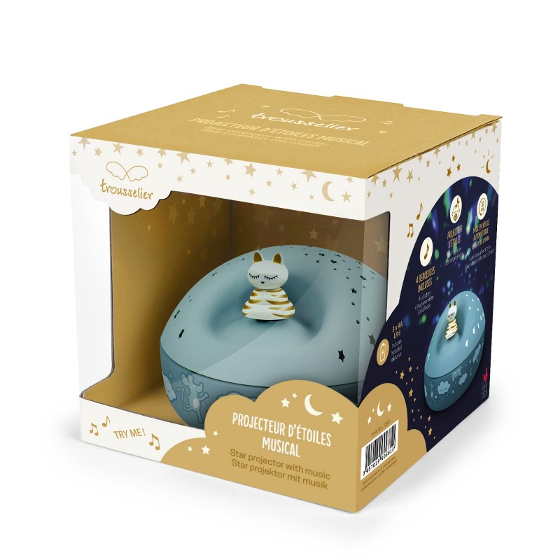 TROUSSELIER – Chat – Veilleuse – Idéal Cadeau Enfant – Projecteur d’Etoiles Musical – Figurine rotative – Piles incluses