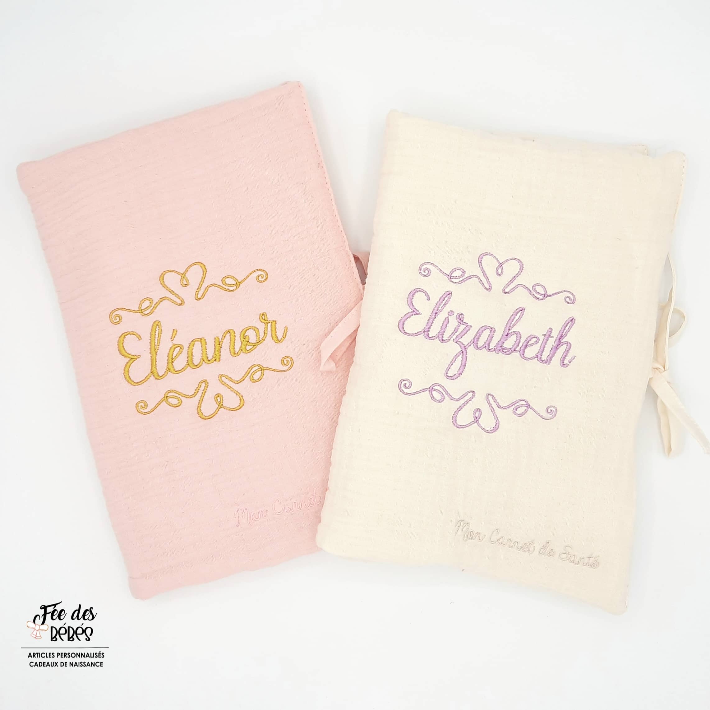 Si vous cherchez à offrir un cadeau de naissance personnalisé, ce protège carnet de santé est la réponse. Les futurs parents seront touchés par tant d’attention et de soin. Ils imagineront déjà leur mignon petit trésor, son bavoir personnalisé autour du cou, emmitouflé dans son pyjama assorti, se dirigeant vers son premier rendez-vous médical avec son élégant protège carnet en gaze de coton. Pour fille ou garçon, couleur noisette, crème, rose ou encore vert paon, ils se démarqueront tout en finesse.
