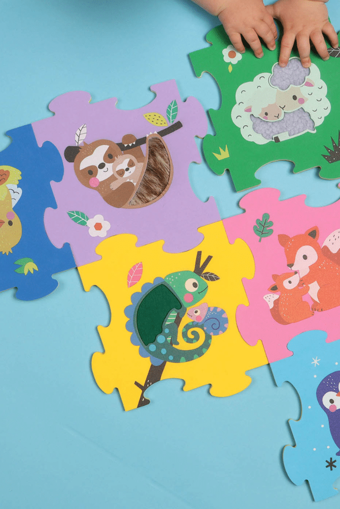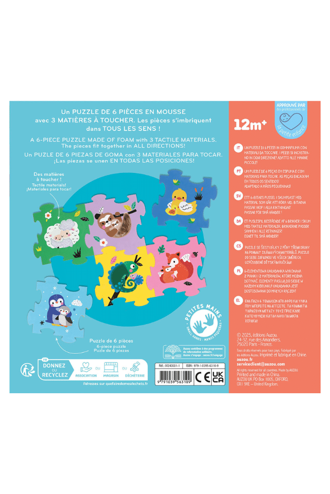 Découvrez le puzzle en mousse avec 3 belles maitères à toucher pour développer l’éveil sensoriel de votre petits. 6 grandes pièces colorés avec d’adorables animaux qui peuvent s’assembler comme l’enfant le souhaite, pour un puzzle refaisable à l’infini !
