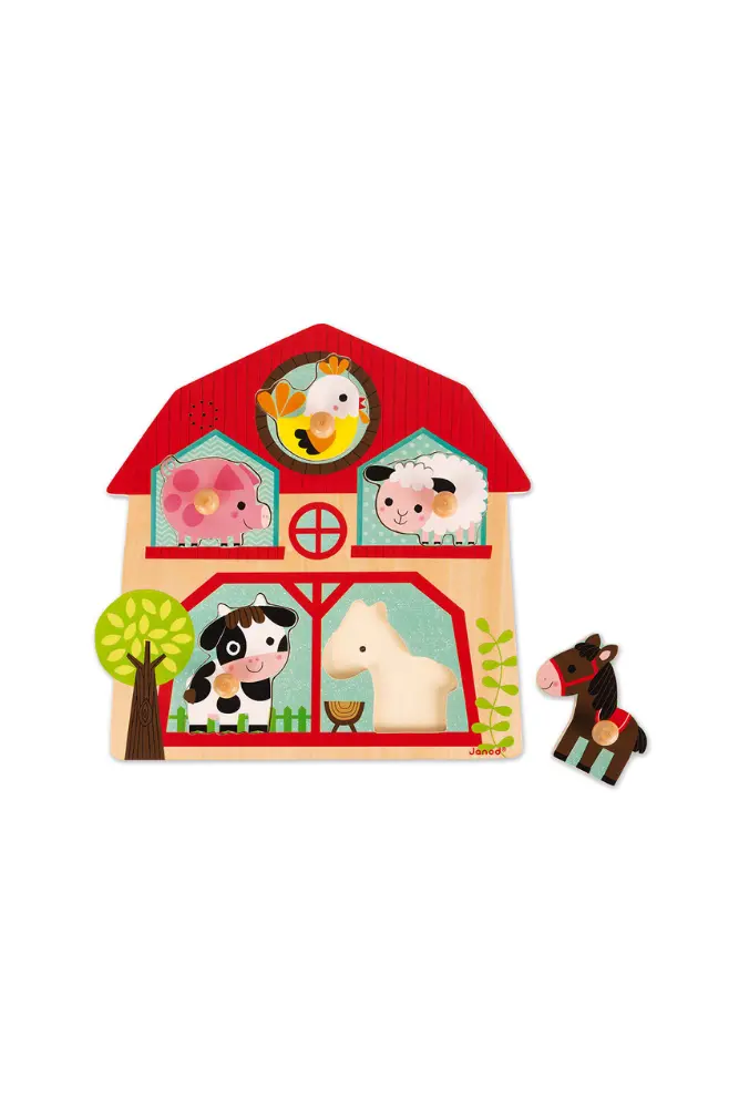Ce Puzzle musical sur le thème des animaux de la Ferme aidera votre enfant à se familiariser avec les animaux. Lorsque l’enfant pose la pièce de puzzle à la bonne place, le cri de l’animal retentit. Grâce aux tenons en bois, la prise en main des pièces du puzzle est plus facile.