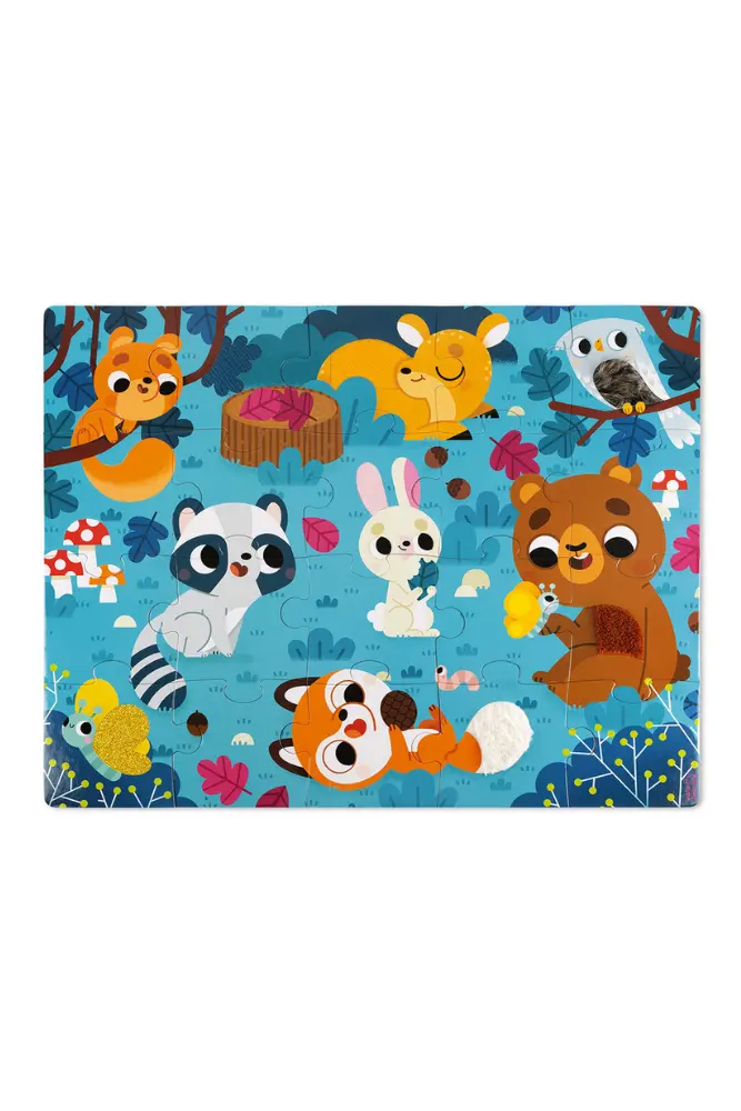 Découvrez le Puzzle tactile sur le thème des animaux de la forêt ! Après avoir réalisé le puzzle, votre enfant pourra découvrir différentes textures et matières un peu partout sur le puzzle et développera ainsi son sens du toucher et de l’observation. La taille des pièces est adaptée aux petites mains et un poster servant de modèle est inclus. Ce puzzle est composé de 20 pièces, dont 7 pièces texturées pour partir à la découverte de ses sens et des animaux qui peuplent la forêt.