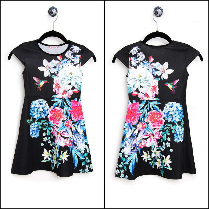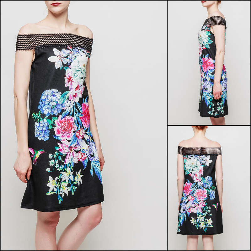 Comme Maman, la plus belle pour aller danser… Robe noire, motifs floraux, et épaules dénudées pour Maman. composition : 95% polyester 5% elasthane A partir du 2 ans.