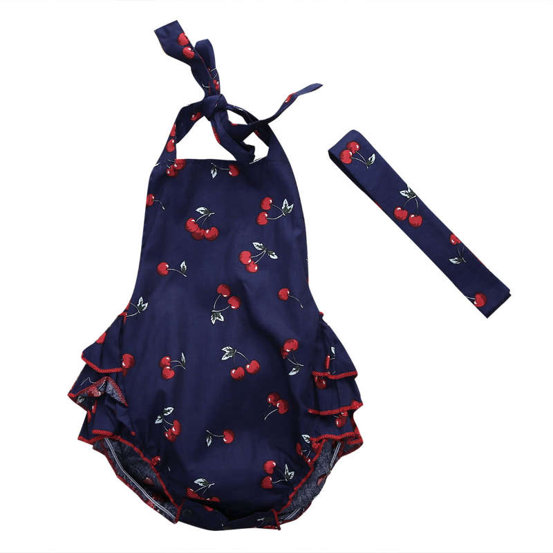 Un look mère fille pour cet été! Robe cintrée avec une bande plus serrée à la taille et bouffante sur le bas. Bleu marine ou blanche avec motifs cerises rouges. Barboteuse dos nu pour bébé accompagnée de son bandeau (uniquement en bleu marine). composition : 65% coton et 35% polyester