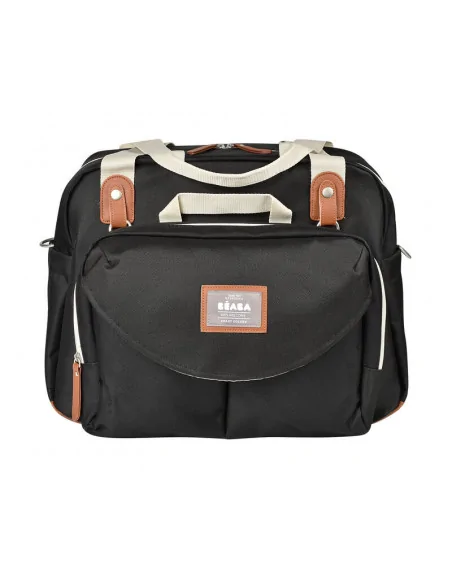Sac à langer bandoulière noir uni Genève Béaba avec matelas à langer, pochette à tétine et pochette repas isotherme.