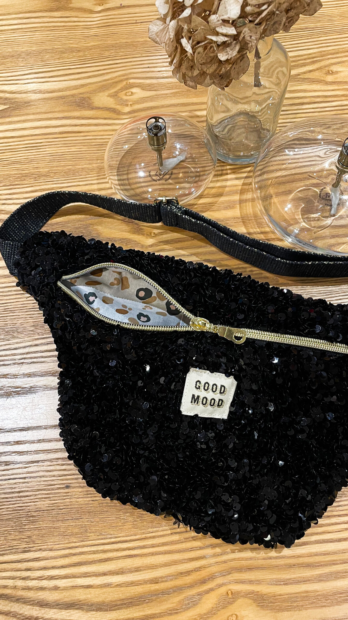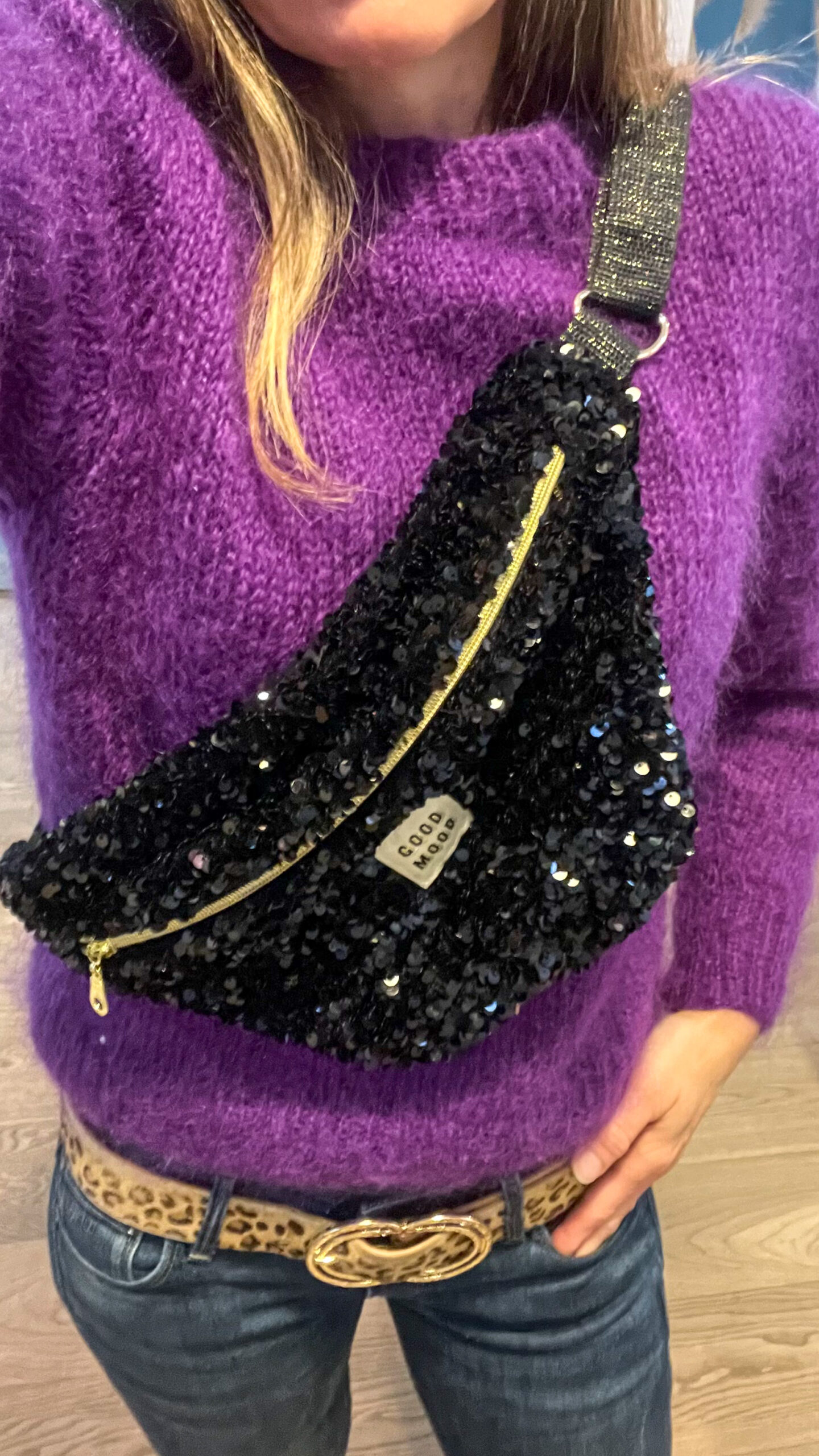 Sac banane en velours sequins noirs pour femme, idéale pour emmener vos indispensables au quotidien. Sangle noire et or .