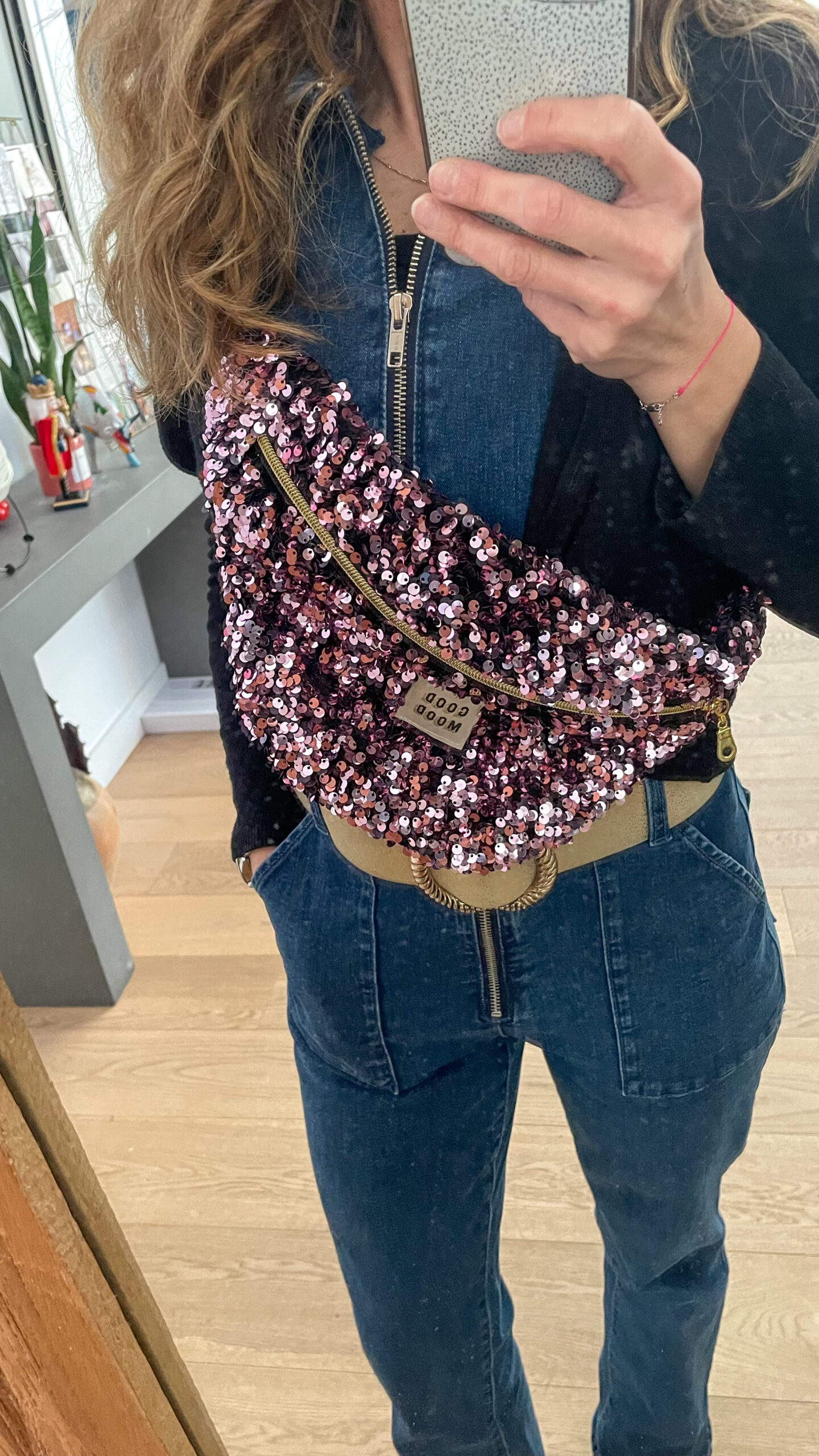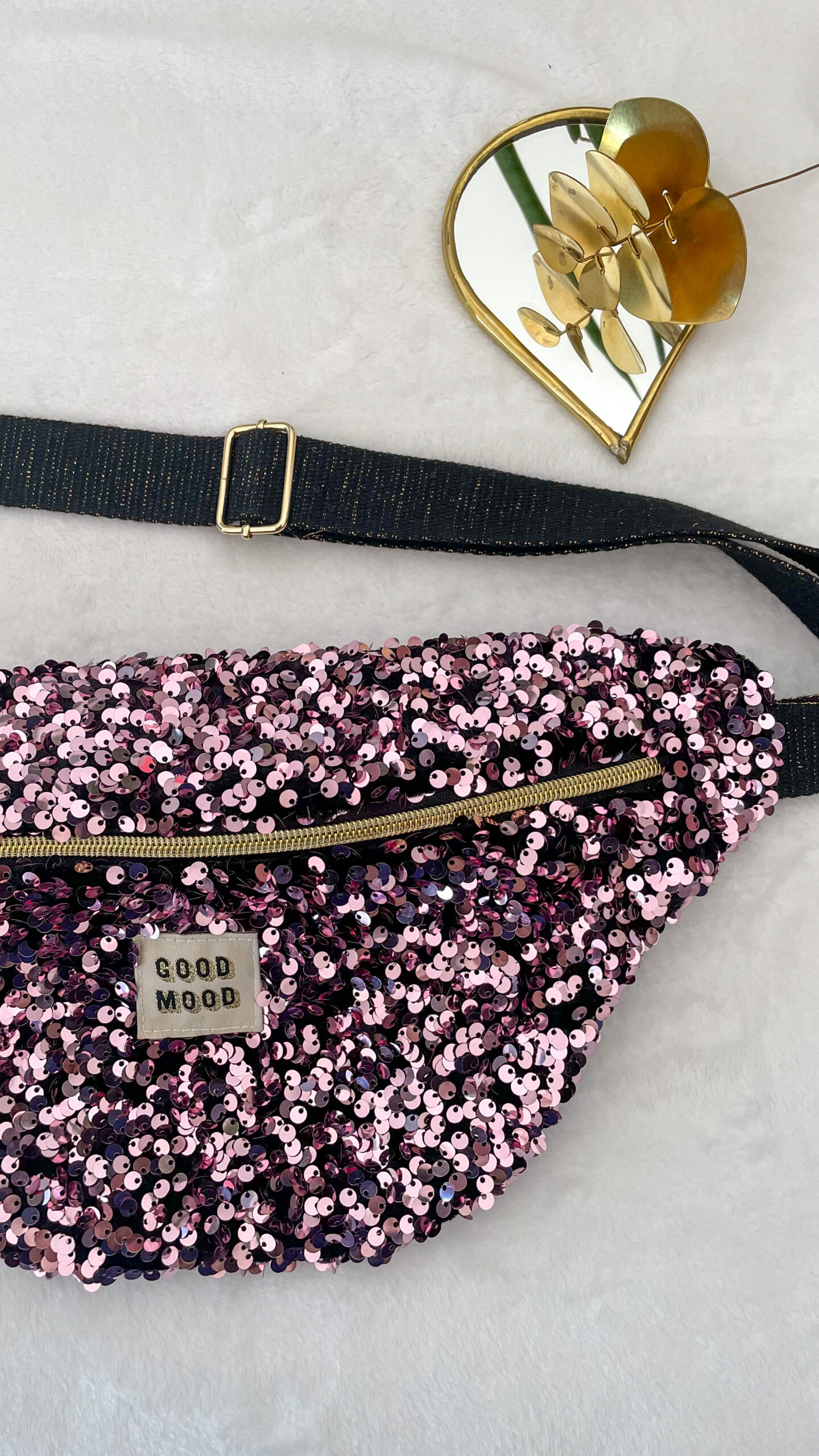 Sac banane à sequins rose pour femme, idéale pour emmener vos indispensables au quotidien. Sangle noire et or .