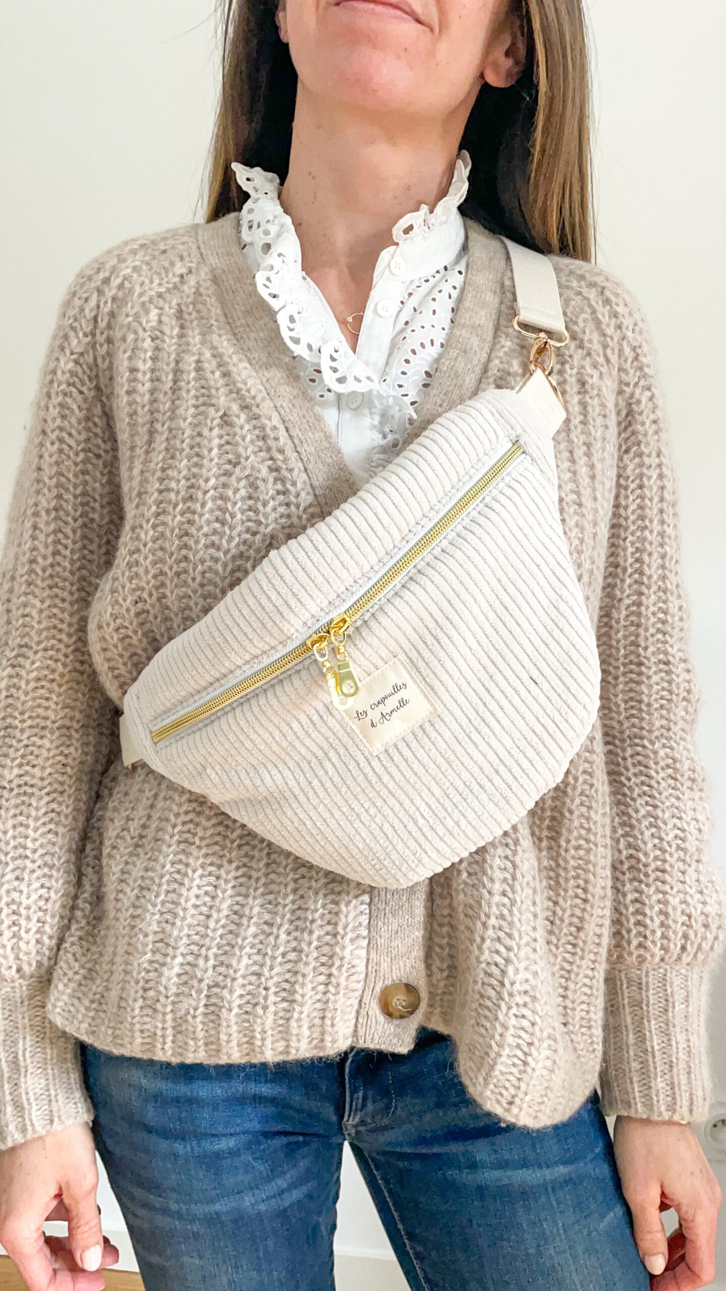Sac banane en velours écru pour femme, idéale pour démarrer l’automne. Merveilleuse doublure fleurie