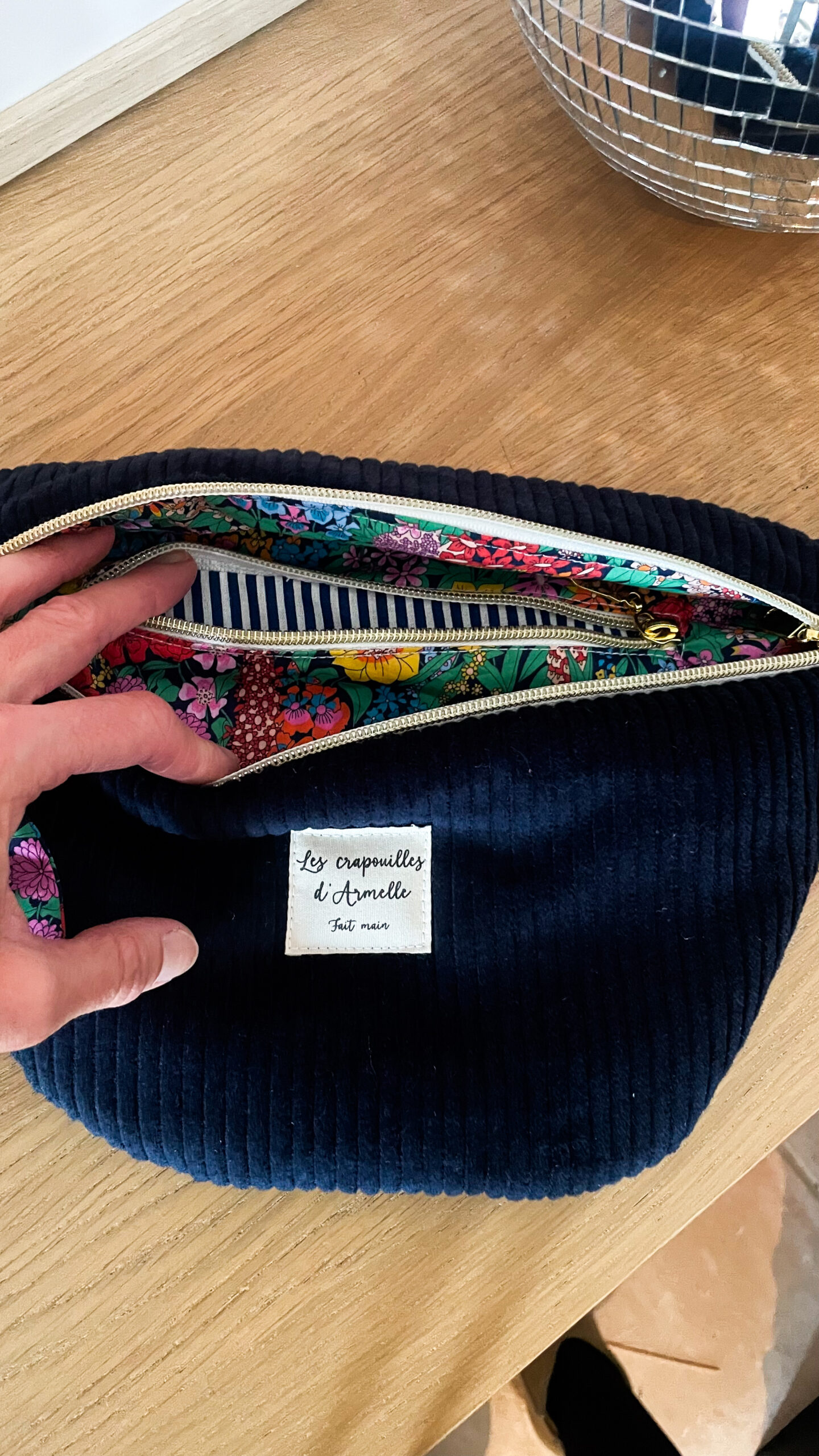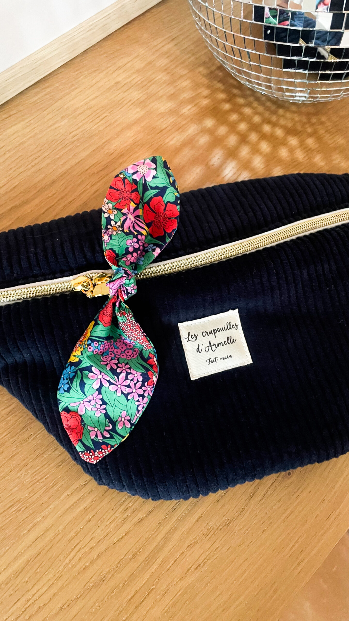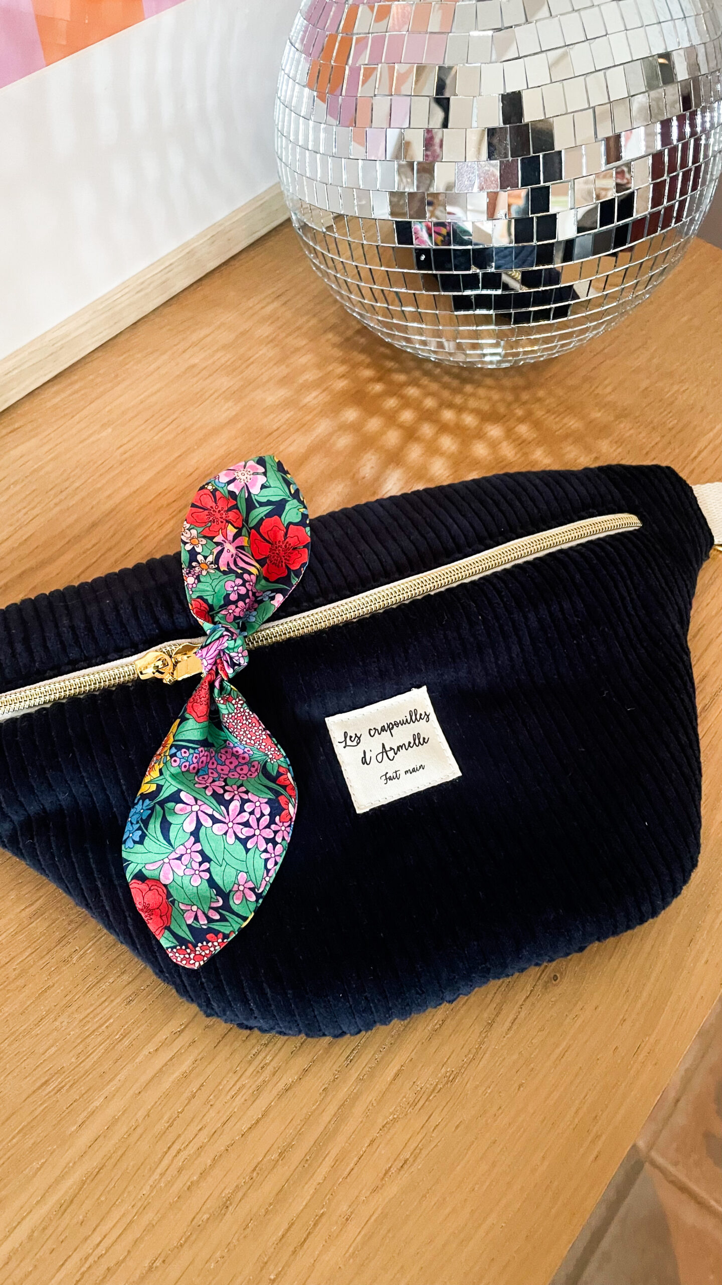 Sac banane en velours marine pour femme, idéale pour démarrer l’automne. Merveilleuse doublure fleurie